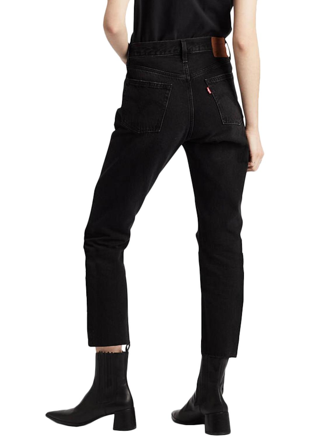 Jeans Levis. Modelo 501. Cor preta. Corte acima do tornozelo. high rise. Fechamento de botão. Defina slim. Cinco bolsos. Remendo da marca na cintura. Etiqueta emblemática no bolso traseiro.