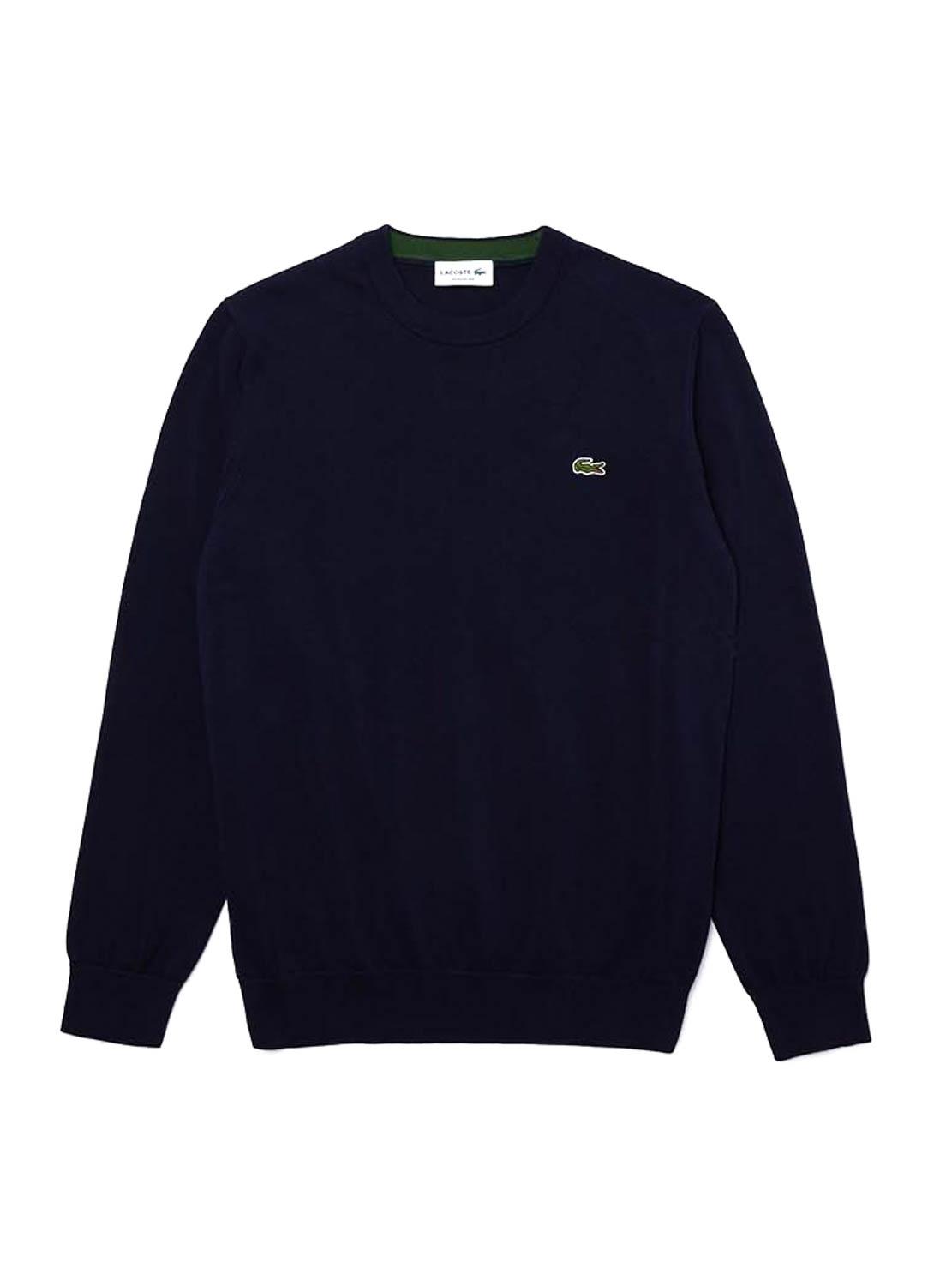 Camisola Lacoste. Modelo redondo. Cor da Marinha. Pescoço redondo. Extremidades com nervuras. Logótipo bordado no peito.