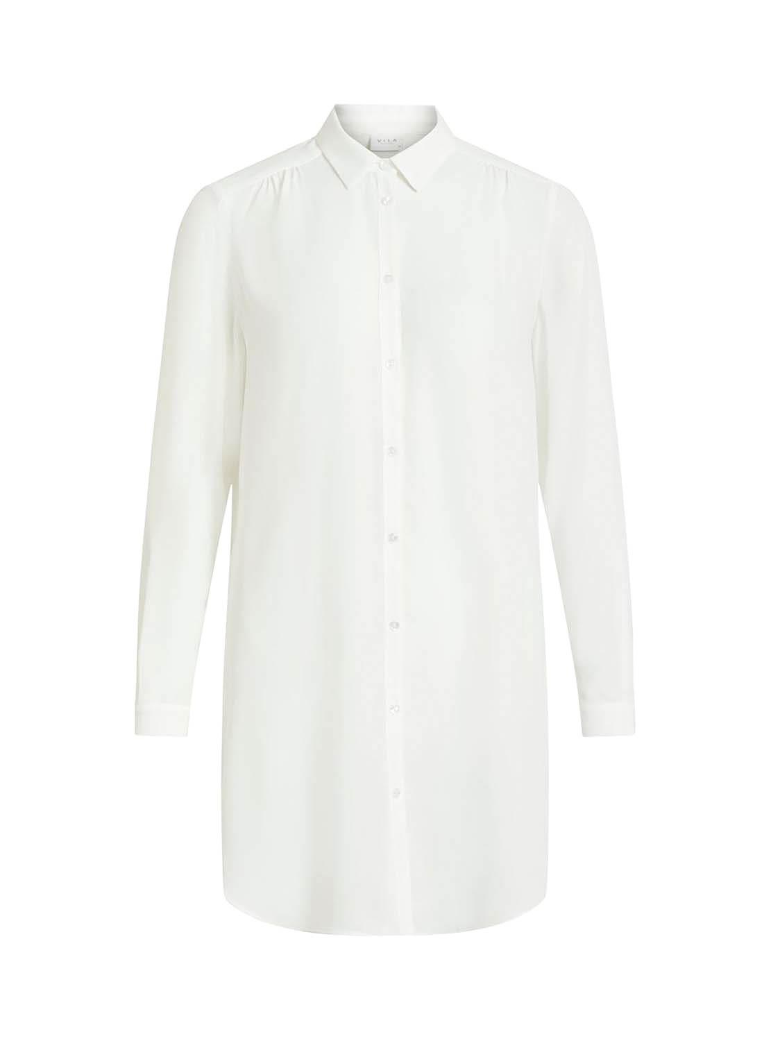 Camisa Vila. Modelo Vilucy. Cor branca. Fechamento de botão. Corte longo. Estilo de túnica. Regular fit Bainha arredondada. Tecido leve. Manga comprida.