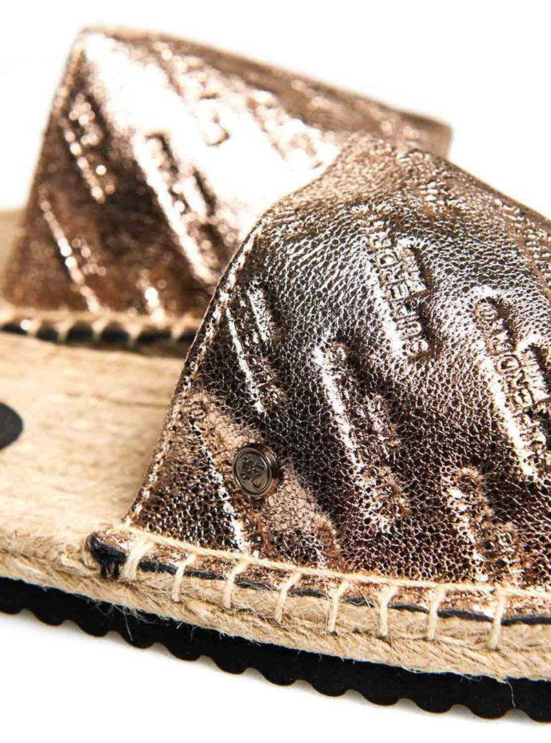 Alpercatas Superdry. Modelo Maya. Cor metálica. Correia frontal larga. Logo na sola. Logos de Superdry gravados na bracelete. Sola de borracha