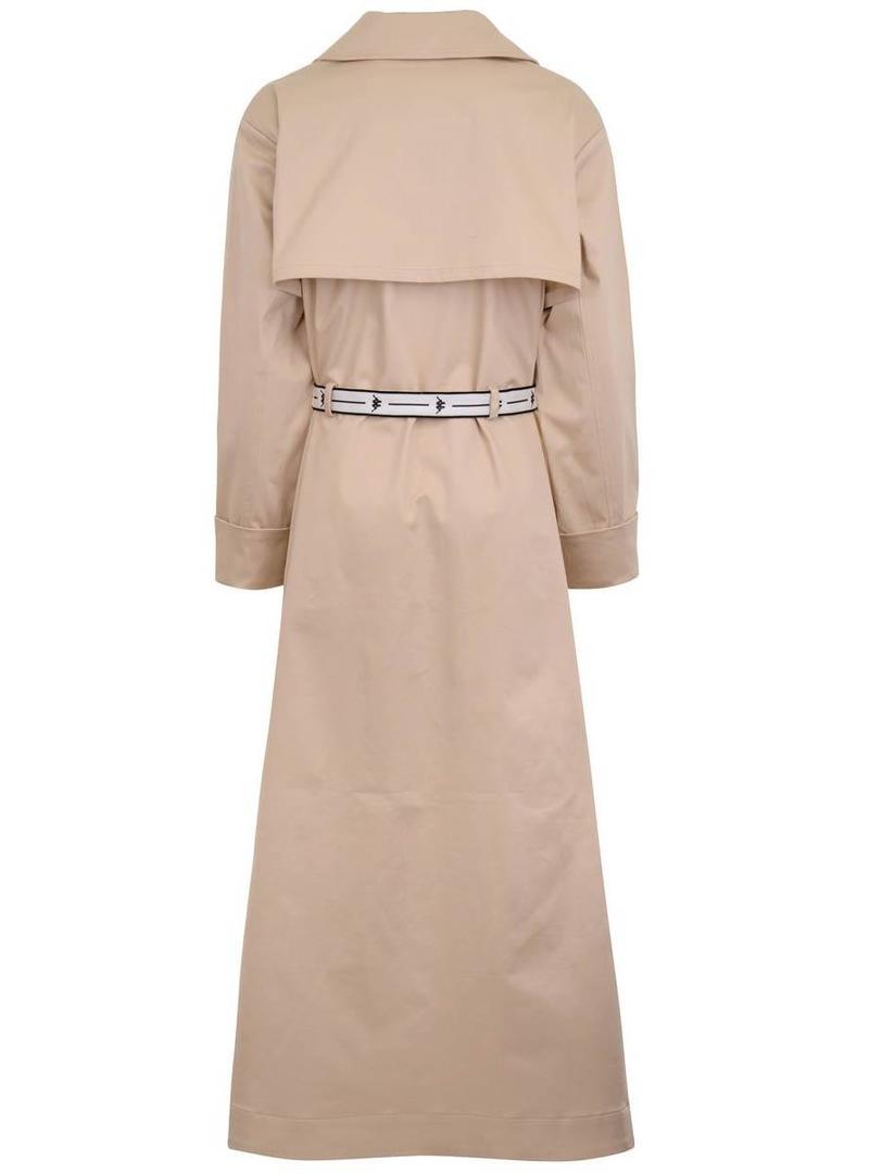 Casaca Kappa. Modelo Datane. Bege e branco. Cinto com logotipo. Fechamento de botão. Colarinho da camisa. Longo.