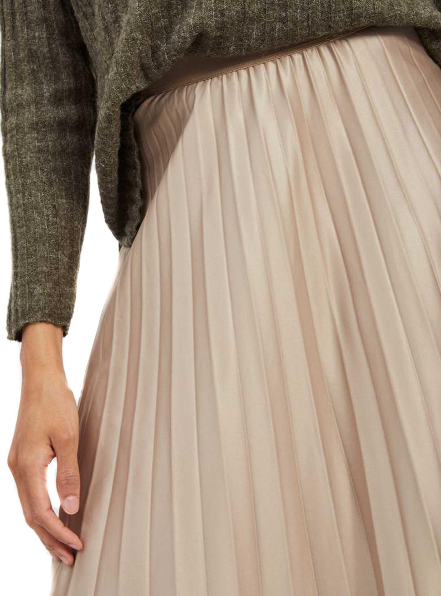 Saia Vila. Modelo Nitban. Cor bege. Cintura elástica. Plissado. Corte midi. A modelo usa tamanho 38.
