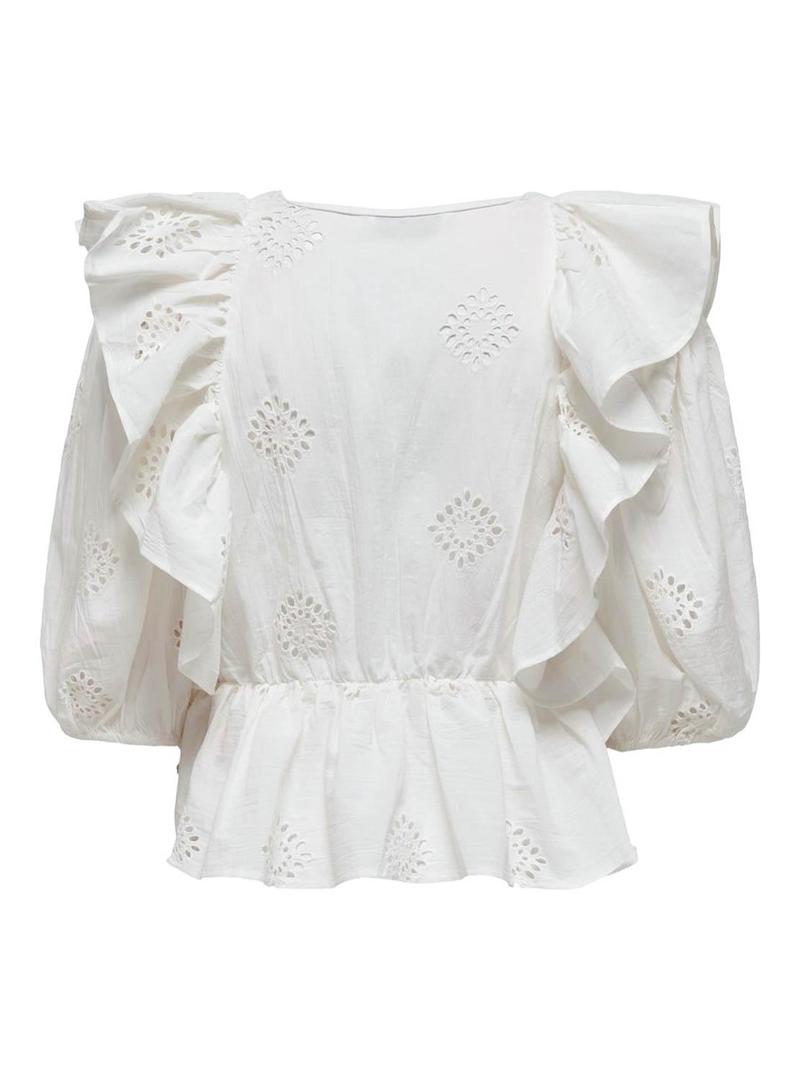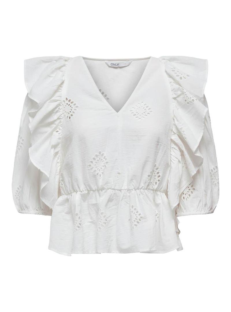 Camisa Only. Modelo Irma. Cor branca. Detalhes com nervuras. Babados nas mangas e na cintura. Decote em V. Mangas curtas. A modelo usa tamanho S.