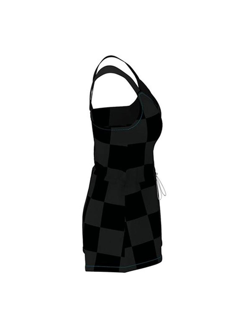 Jumpsuit Kappa. Modelo Elaisa. Impressão quadriculada. Colorway preto e cinza. Logótipo bordado no peito. Decote em V Cintura ajustável com atacadores. Tiras elásticas cruzadas.