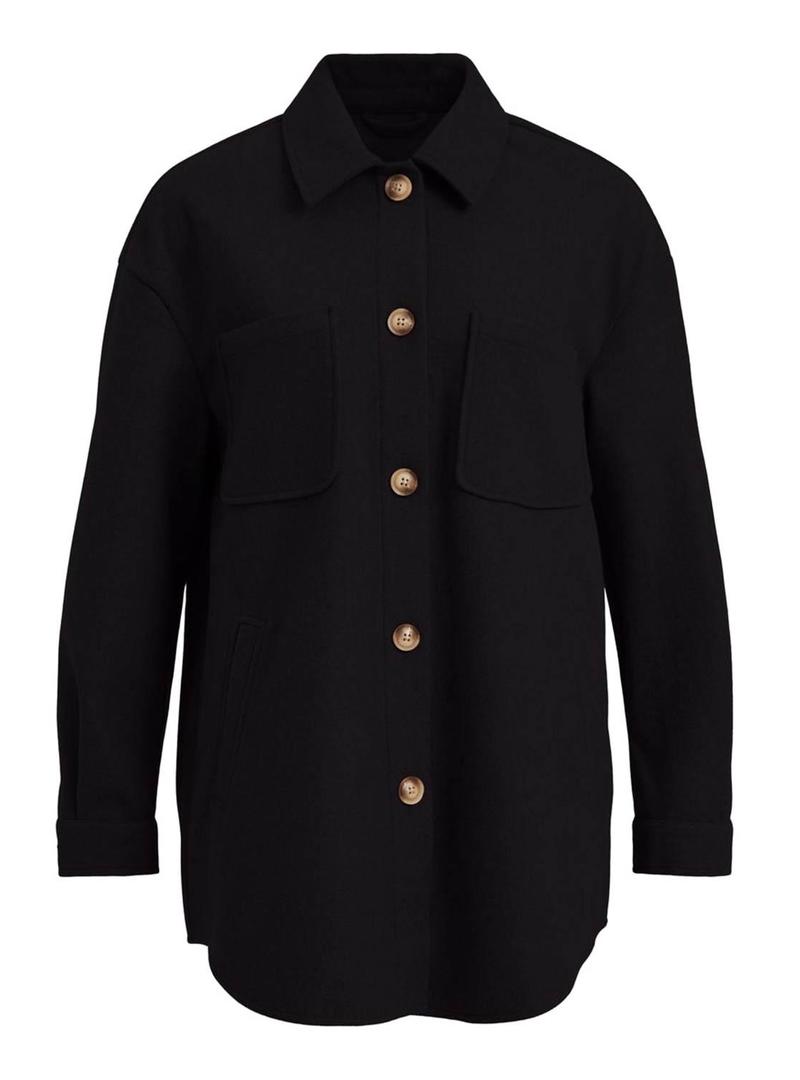 Camisa Vila. Estilo de jaqueta. Ajuste solto. Manga comprida. Cor preta. Bolsos laterais. Fecho frontal com botões. Dois bolsos no peito. A modelo usa tamanho S.