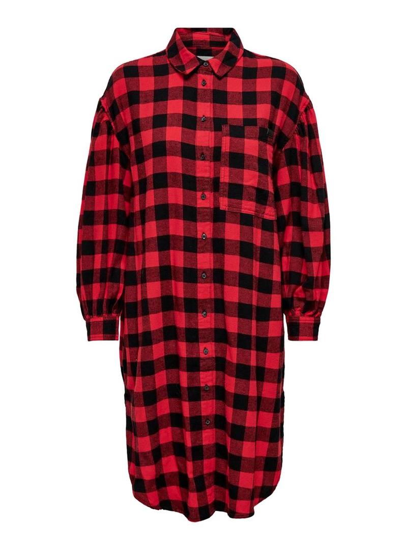 Camisa Only. Modelo Cherri Life. Impressão quadriculada vermelha e preta. Fechamento de botão. Mangas compridas bufantes com punhos de botão. Grande A modelo usa tamanho S.