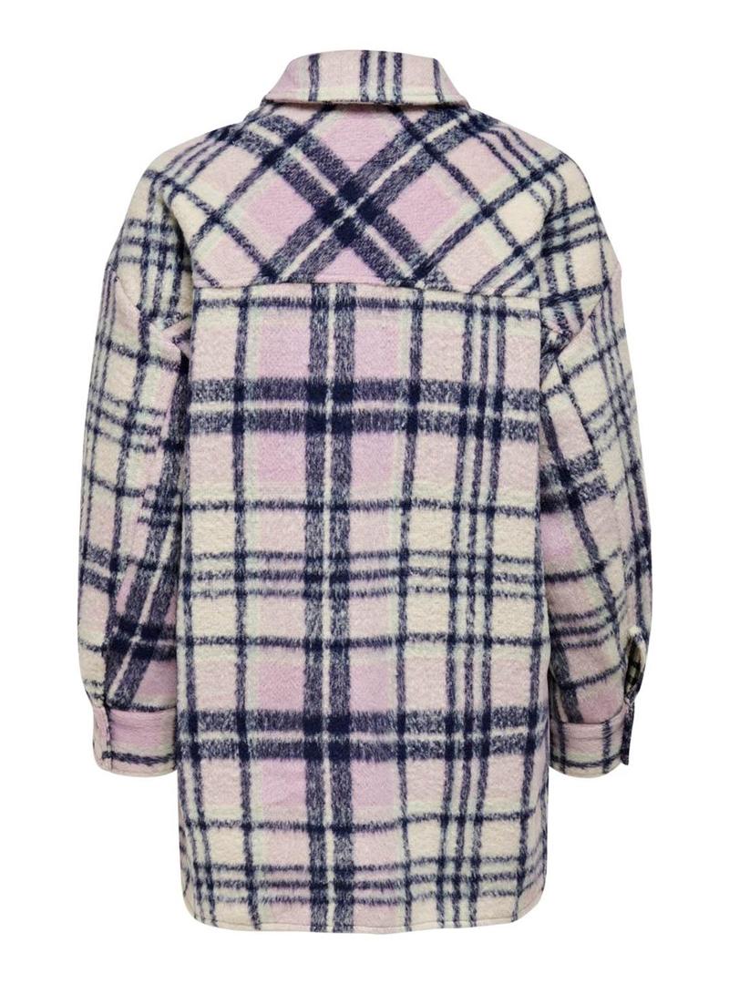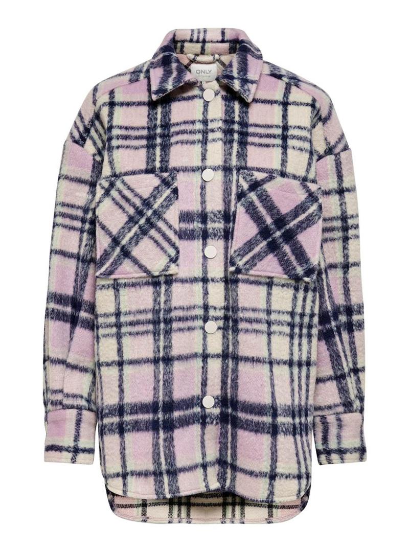 Camisa Casaca Only. Impressão quadriculada. Corte solto. Fecho com botão frontal. Dois bolsos no peito. Manga comprida. Sem forro. A modelo usa tamanho S.