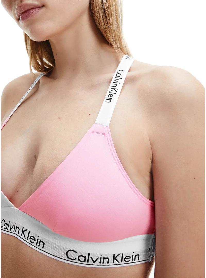 Bra Calvin Klein Jeansw. Formato de triângulo. Cor rosa. Copos macios. Sem forro. Não preenchido. Correias cruzadas ajustáveis nas costas. Banda exclusiva de Calvin Klein. A modelo usa tamanho S.