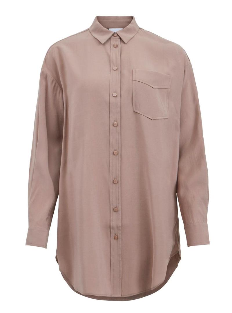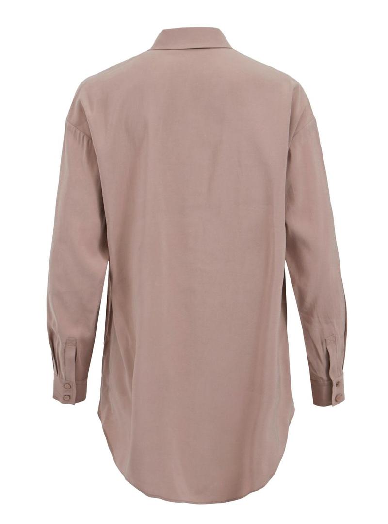 Camisa Vila. Modelo Polinéia. Ajuste superdimensionado. Cor marron. Colarinho da camisa. Fecho de botão. Punhos de botão. Bolso no peito.