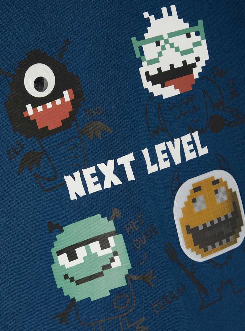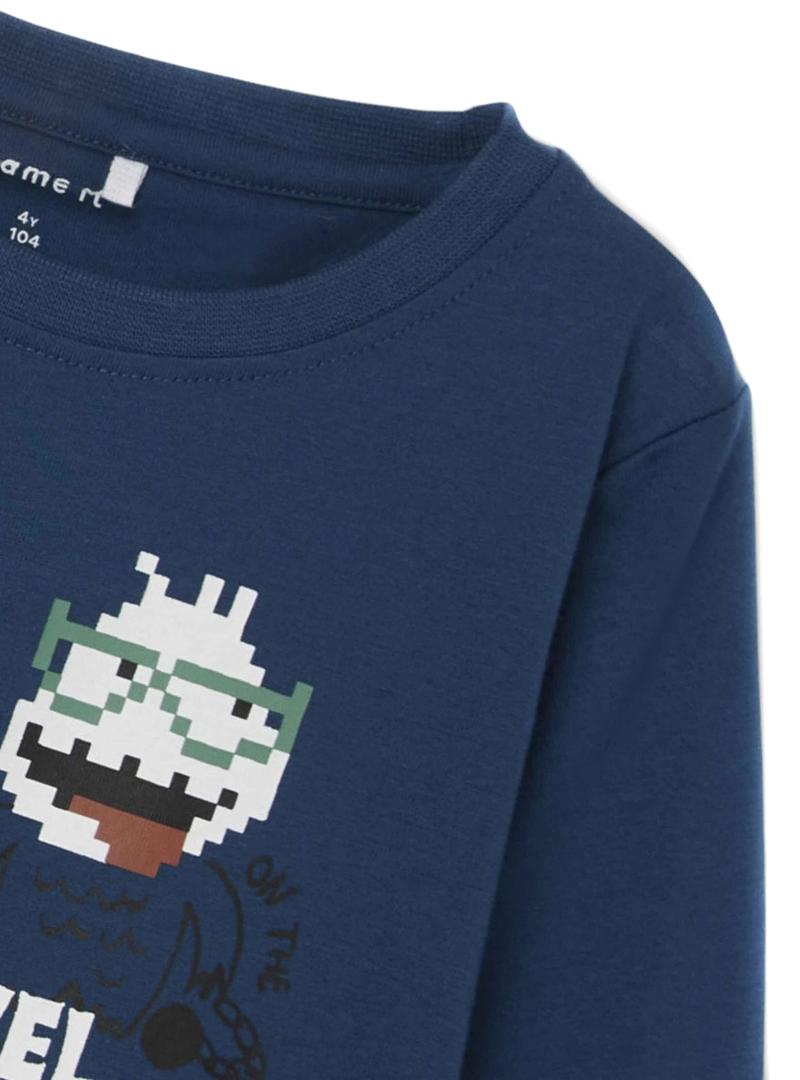 T-Shirt Name It. Modelo Boris. Cor da Marinha. Manga comprida. Tecido leve e elástico. Pescoço redondo. Impressão de tema de jogo frontal.