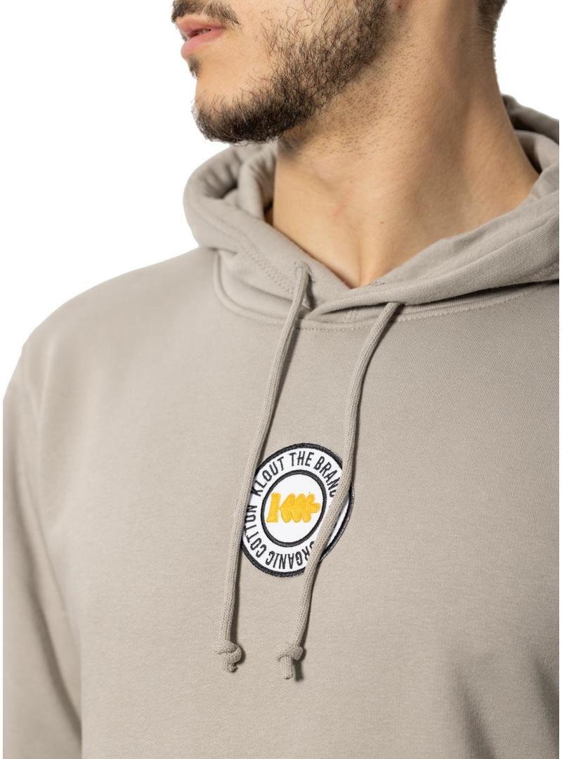 Sweat Klout. Cor cinzenta. Com capuz. Manga comprida. Bolso canguru. Patch com o selo da marca bordado no peito. Detalhes em relevo. Selo da marca impresso no verso. A modelo está vestindo tamanho M.