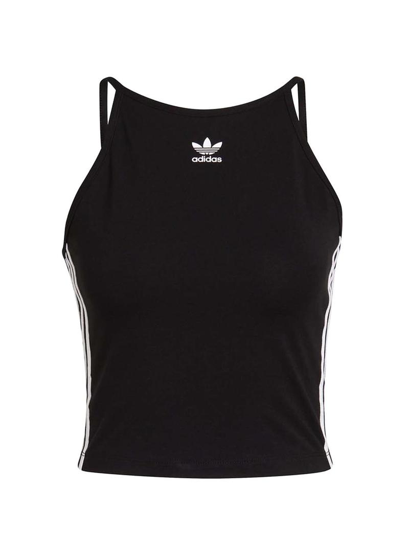 T-Shirt Adidas. Gola redonda com alças. Costas nuas. cor preta. Logo trevo branco no peito. Laterais Listras em branco.