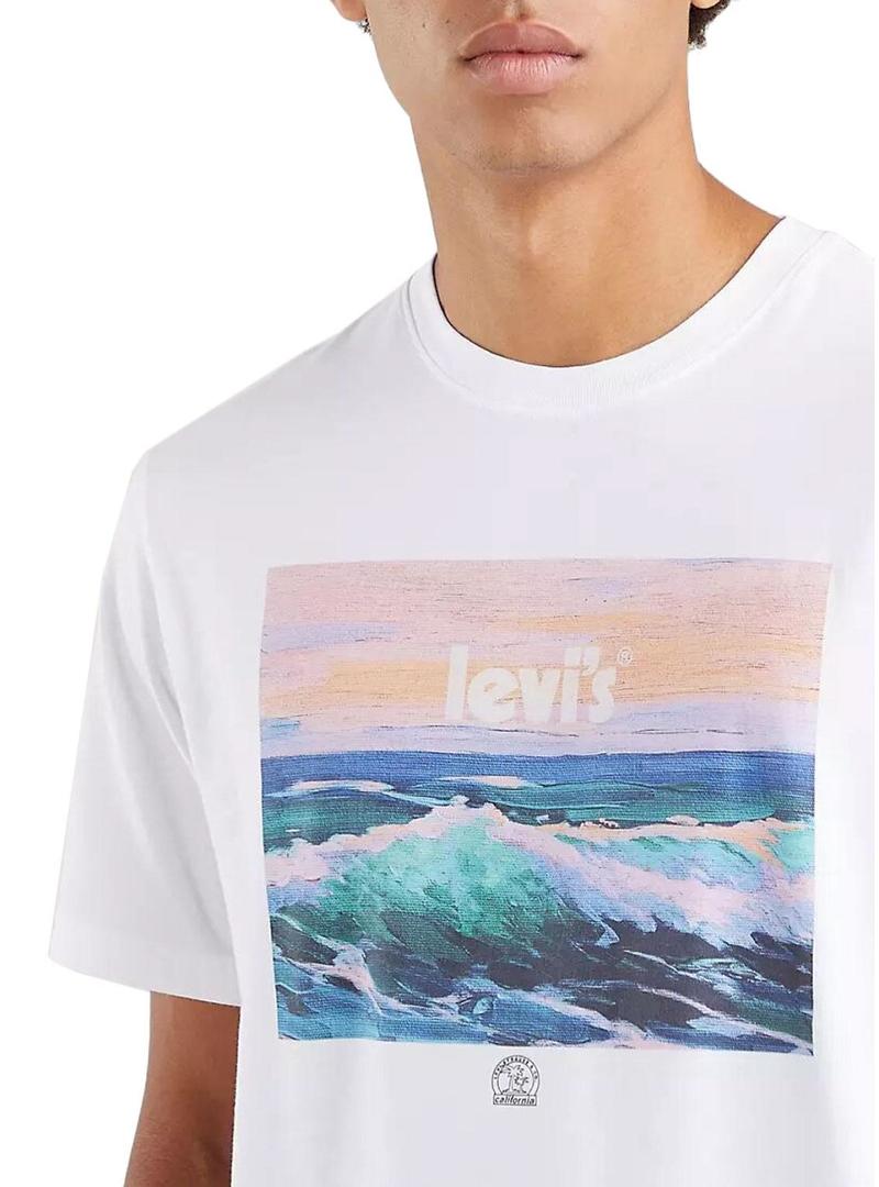 T-Shirt Levis. Modelo Relaxed Wave. Cor branca. Manga curta. Pescoço redondo. Estampa frontal com paisagem ondulada e logo na imagem parte de cima.