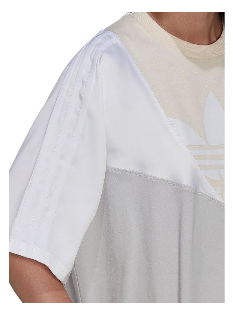 Vestido Adidas. Modelo Originals. Estilo camiseta. Painéis de cores diferentes. Manga curta. Pescoço redondo. Aberturas laterais. Logo estampado no peito. Manga esquerda em tecido translúcido.