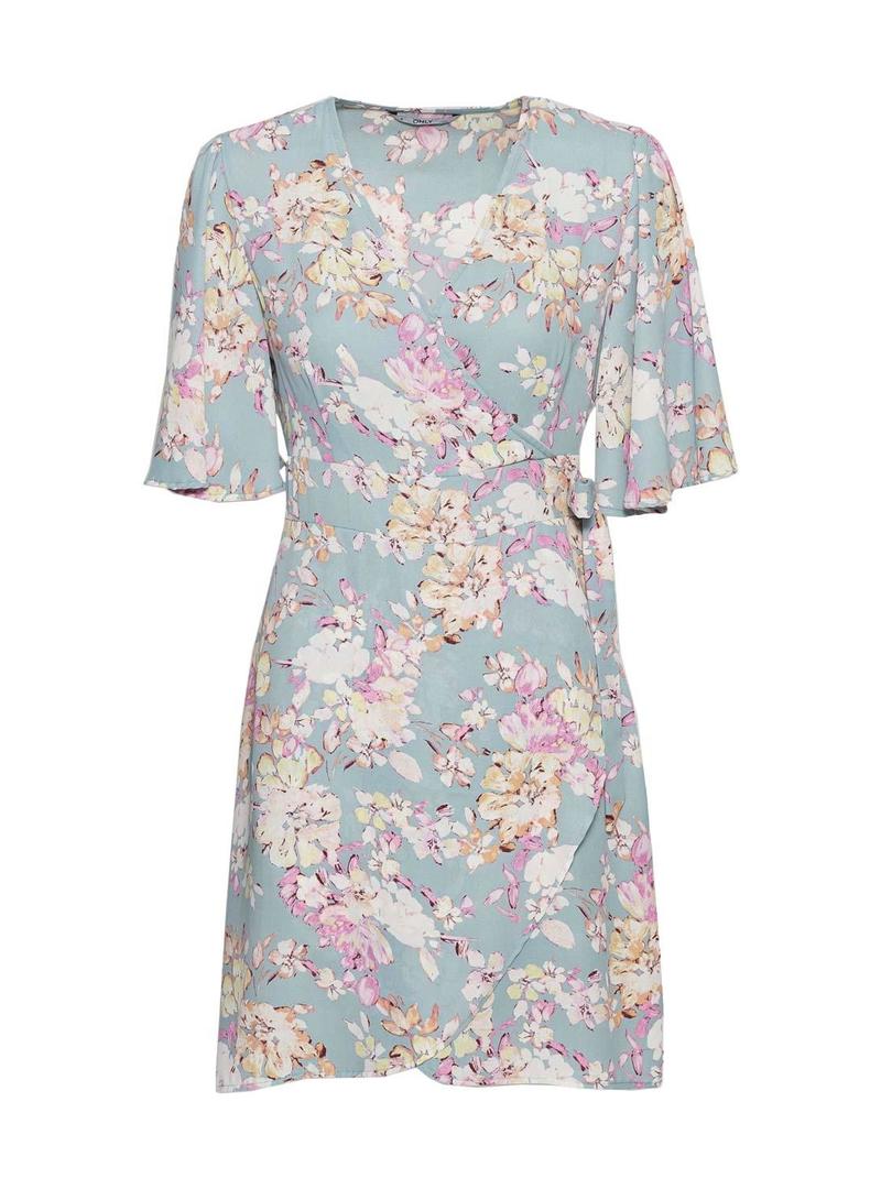 Vestido Only. Modelo Lalica Life. Cor azul. Impresso com flores brancas, bege e lilás. Mangas curtas evasê. Efeito cruzado. Cintura com laço. Gola V.