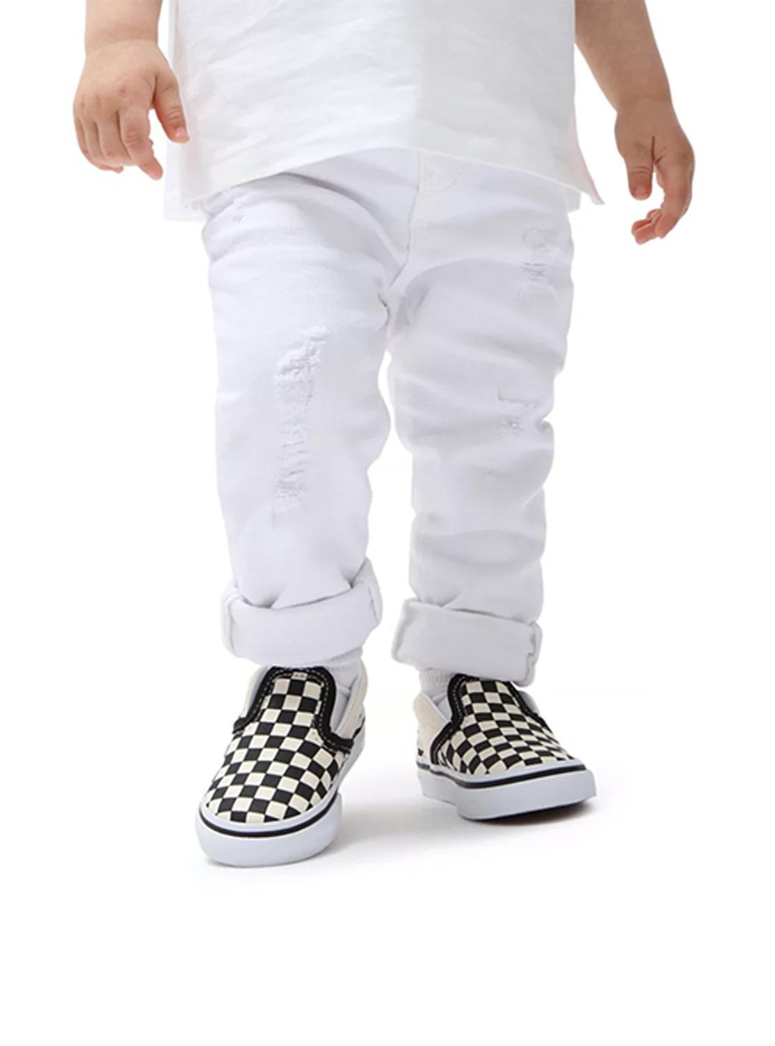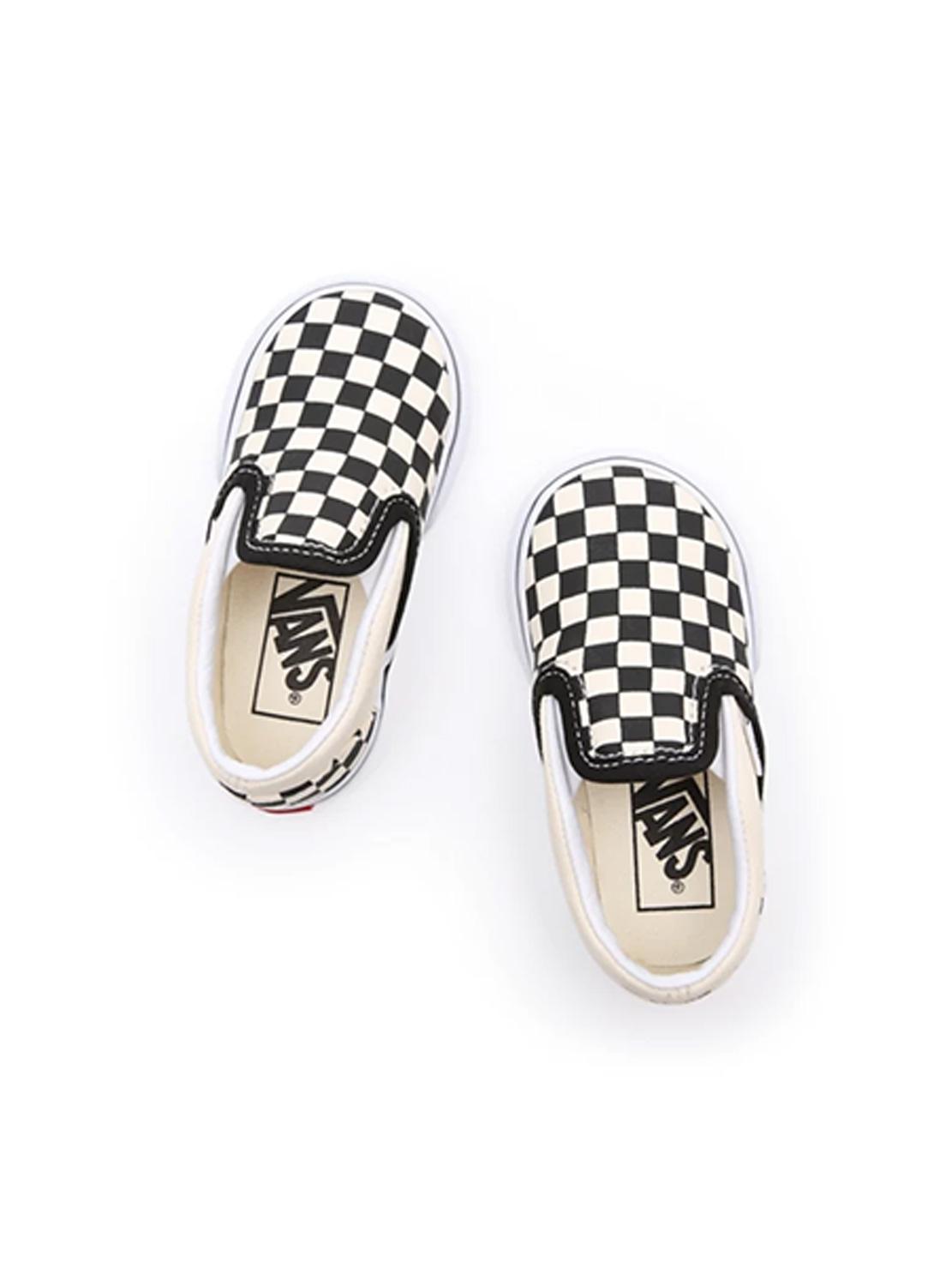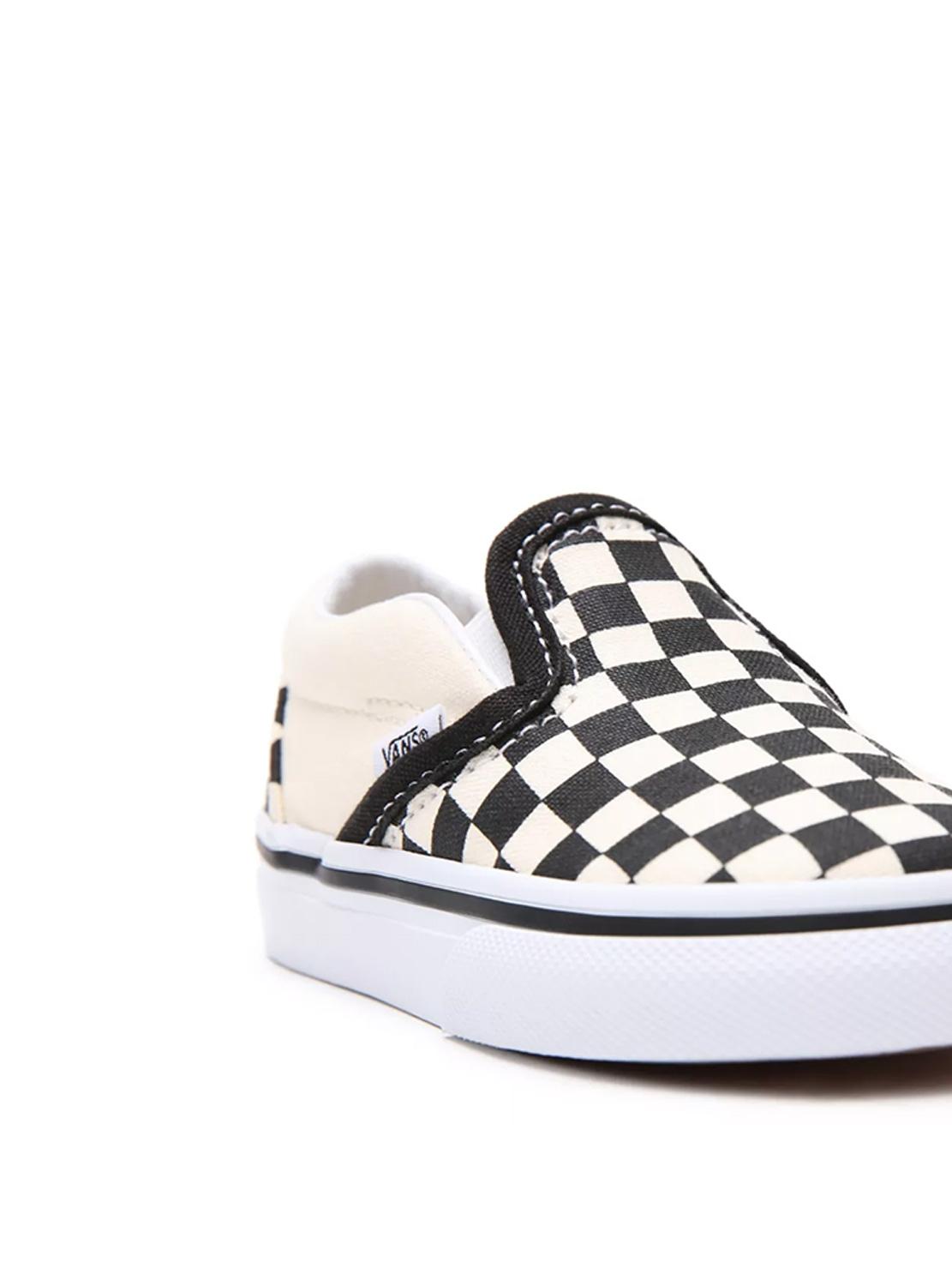Sapatilhas Vans. Modelo Classic Slip On. Estampa quadriculada em preto e bege. Sem fecho. Etiqueta costurada na lateral. Logo na parte traseira.
