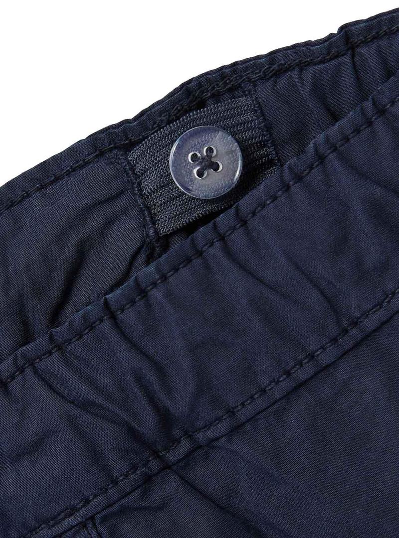 Bermuda Name It. Modelo Ryan Tilip. Cor da Marinha. Estilo de carga. Cintura elástica ajustável com cordões. Bolsos laterais, traseiros e cargo. Etiqueta no bolso.