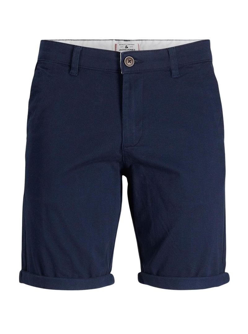 Bermudas Jack e Jones. Modelo Davi. Cor Azul Marinho. Bolsos traseiros. Etiqueta traseira. Presilhas de cinto para . Perna torneada. Fechamento por botão e zíper. Regular.