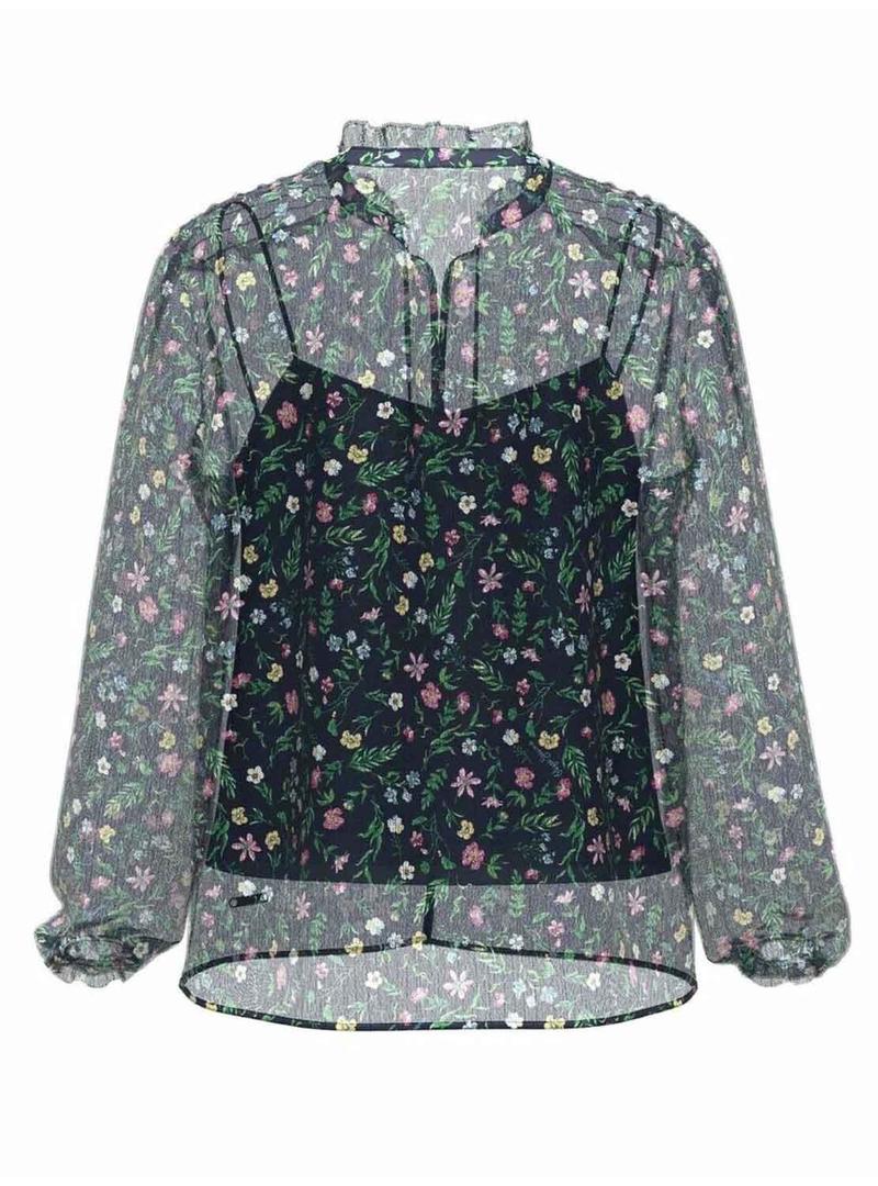 Blusa Pepe Jeans. Modelo Gulsen. Cor da Marinha. Estampa floral. Transparência. Top abaixo. Fechamento frontal com botões. Mangas soltas e punho com borracha.