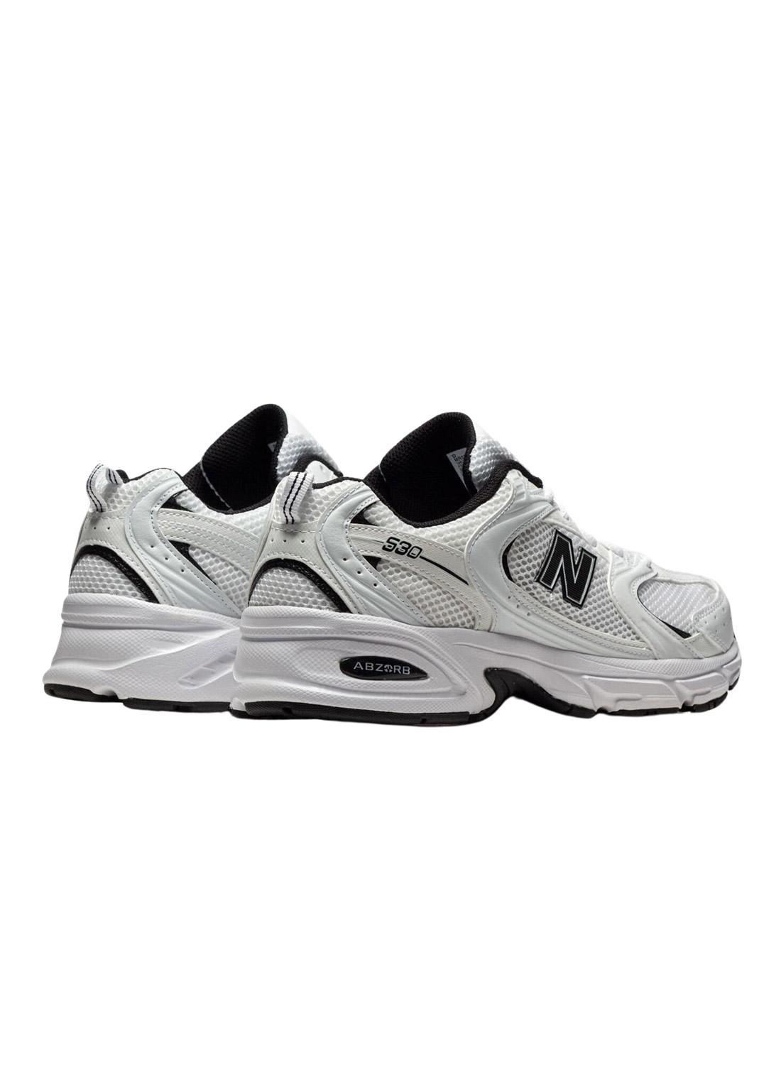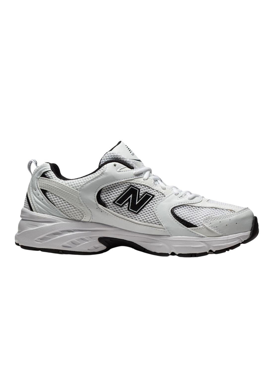 Sapatilhas New Balance. Modelo 530. Cor branca. Fechamento em cadarço. Detalhes pretos. sola alta Preenchido contra o frio. Couro Sintético. Painéis de malha.