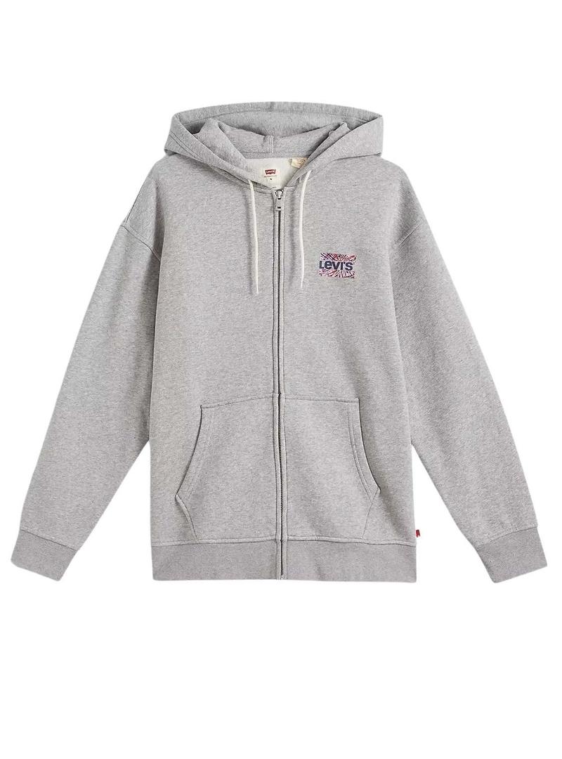 Sweat Levis. Cor cinzenta. Fecho com zíper. Com capuz. ajuste solto Forro polar suave. Bolso canguru dividido. A modelo está vestindo tamanho M.