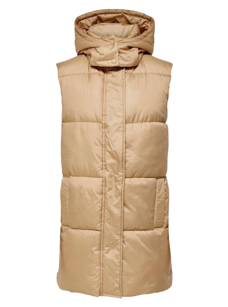 Colete Only. Modelo Demy Padded. Cor camel. Com capuz. Tecido acolchoado. Fecho com zíper. Bolsos nas laterais.