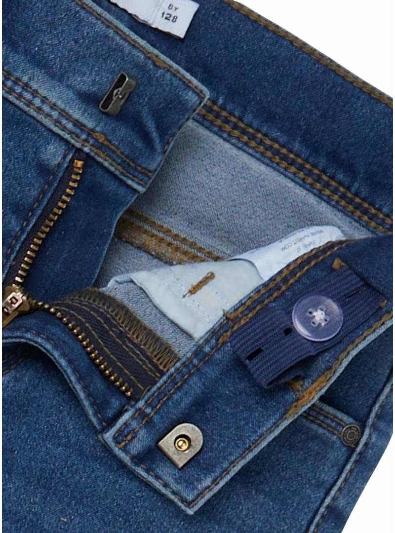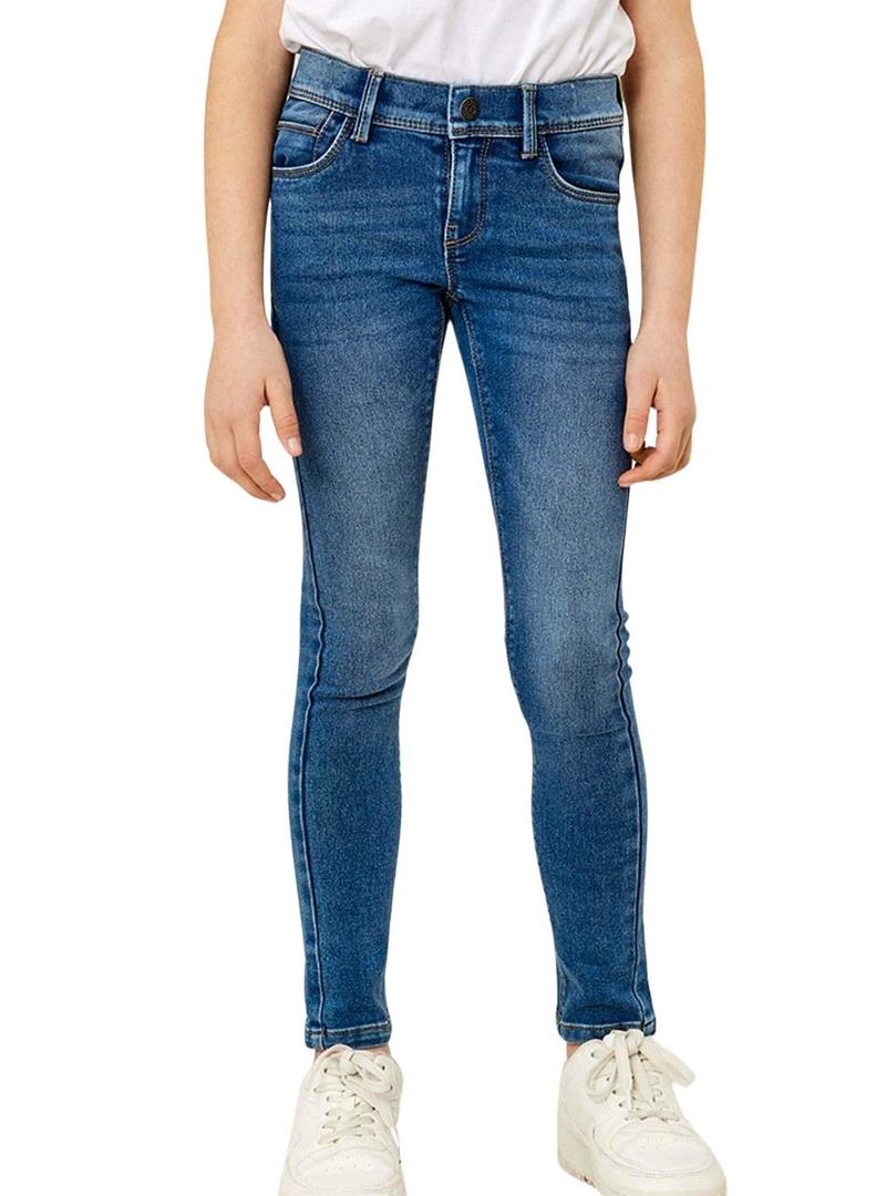 Jeans Name It. Cor azul médio. Fecho de gancho e zíper. Cintura com borracha ajustável. Fit ajustado. Cinco bolsos.