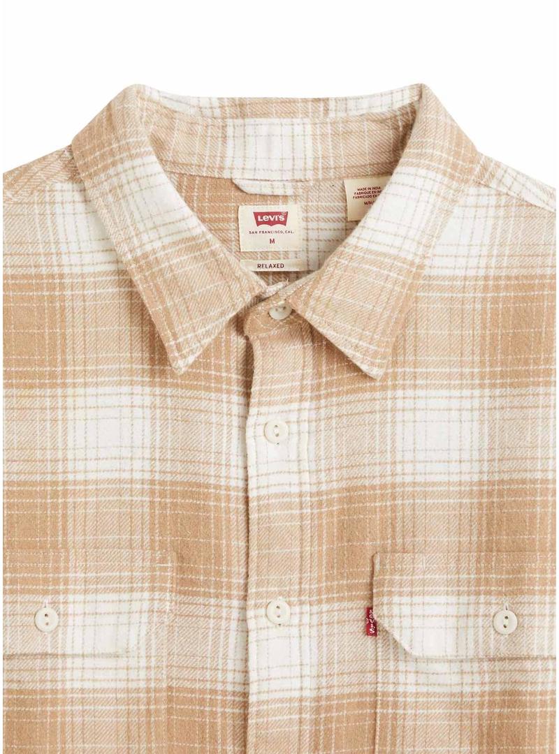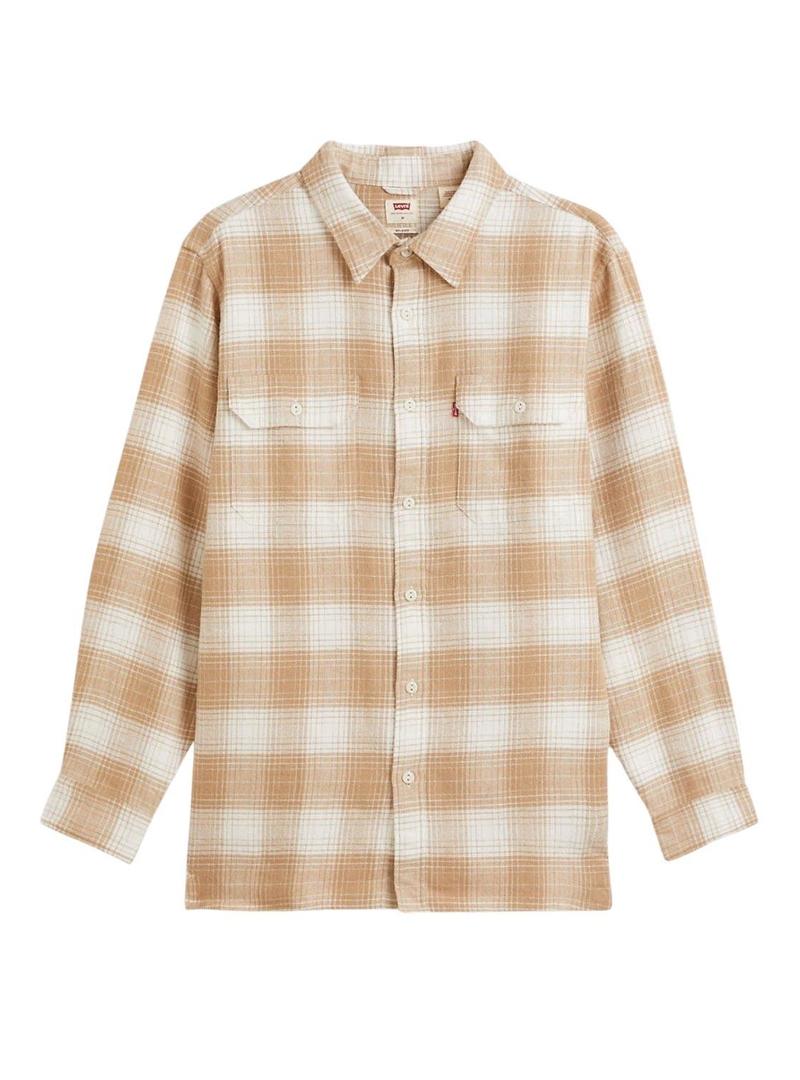 Camisa Levis. Tecido de flanela. Modelo Jackson. Parte inferior arredondada. Cor bege. Printed xadrez em bege e branco. Bolso no peito.