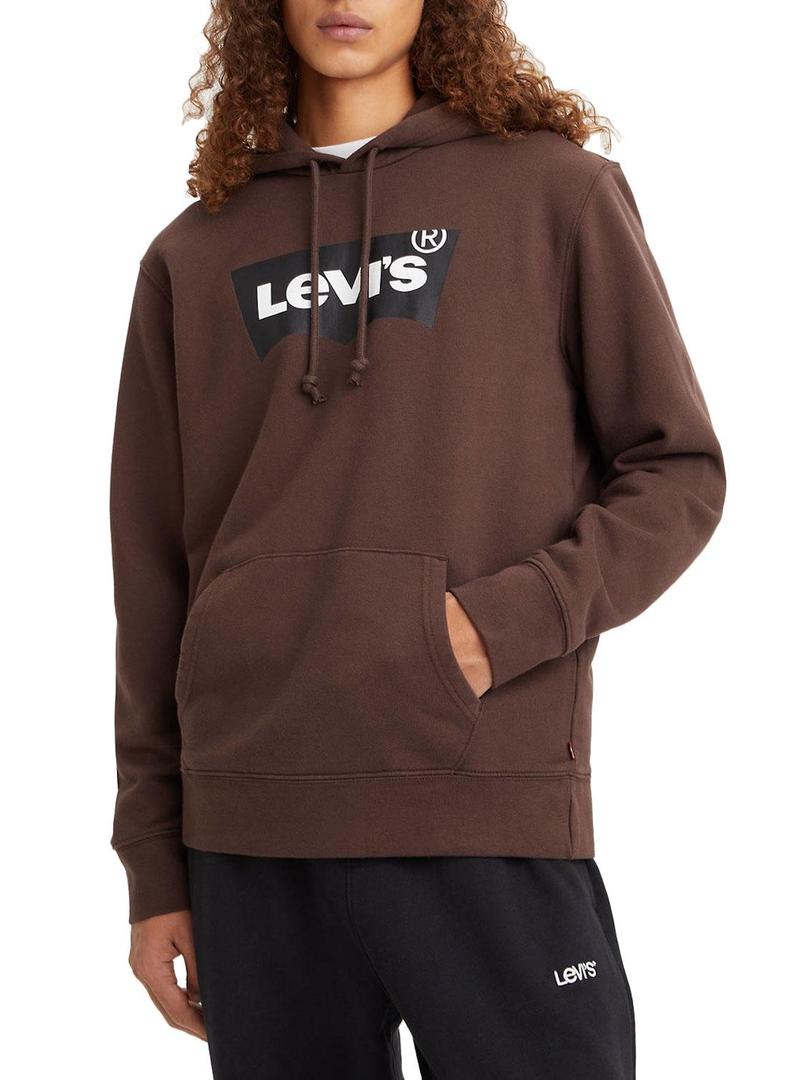Sweat Levis. Cor marrom. Capuz fixado com cordão. Logo Batwing no peito. Bolso canguru. Extremidades caneladas.