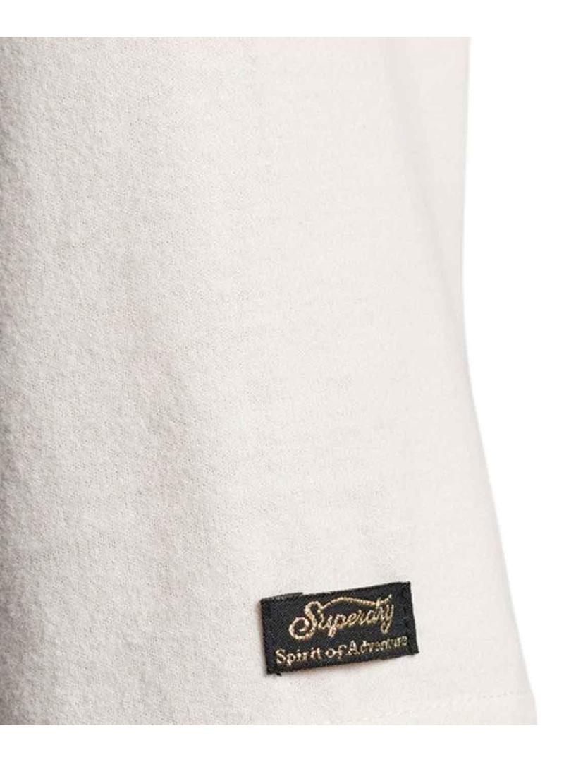T-Shirt Superdry. Cor bege. Pescoço redondo. Mangas curto. Remendo do logotipo. Logo estampado no peito. Corte solto. A modelo está vestindo tamanho P.