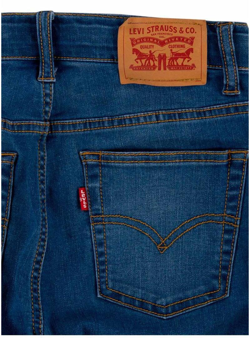 Bermudas Levis. Modelo Eco. Cor azul. Cintura elástica com passadores de cinto. 5 bolsos. Detalhes desgastados. Patch da marca nas costas. Slim fit.