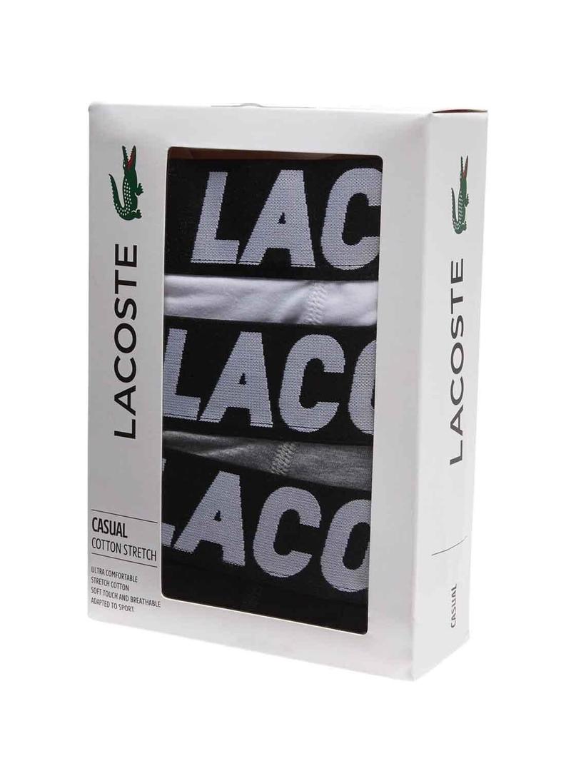 Cuecas Lacoste. Modelo casual. Cor cinza. Pack de 3 unidades. Elástico com logo da marca na cintura.