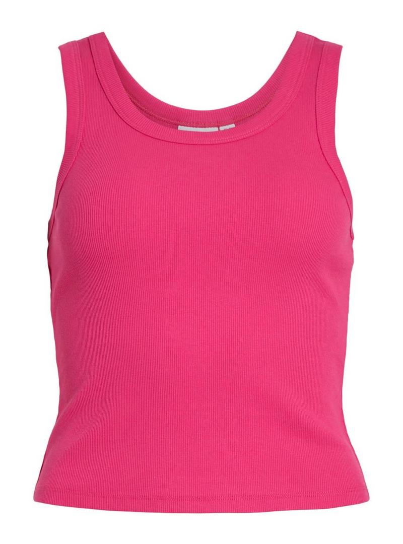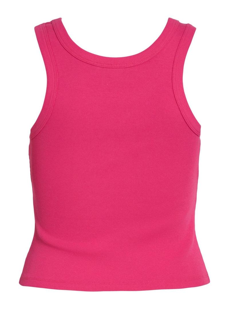 Top Vila. Modelo costa. Cor rosa. Pescoço redondo. Sem mangas. Tecido elástico. corte normal.