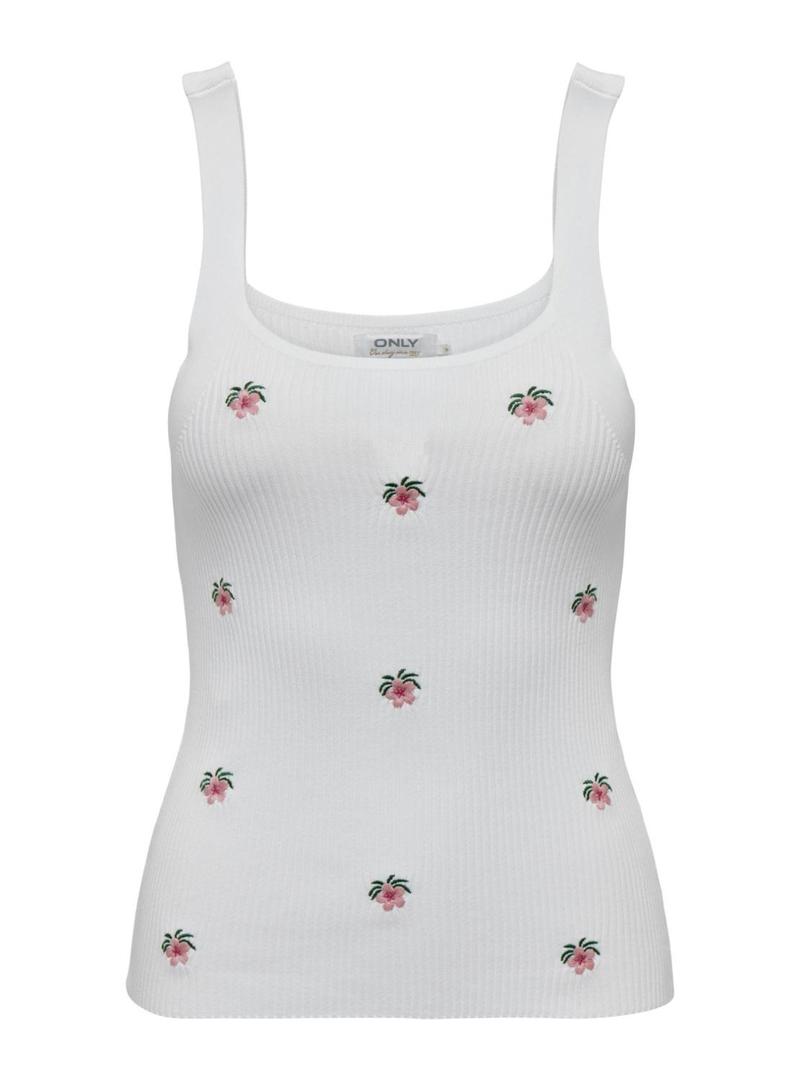 Top Only. Modelo Lula. Cor branco. Sem mangas. Flores bordadas. Pescoço redondo.