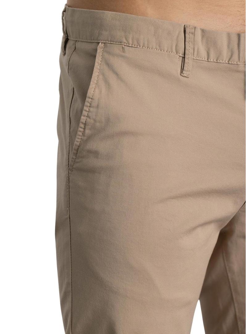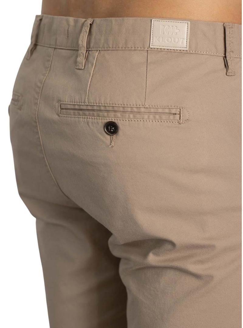 Bermuda Klout. Modelo básico. Estilo chino. Cor bege. Fechamento por botão e zíper. Dois bolsos laterais. Dois bolsos traseiros. Corte slim. Patch ecológico com logo bordado na cintura.