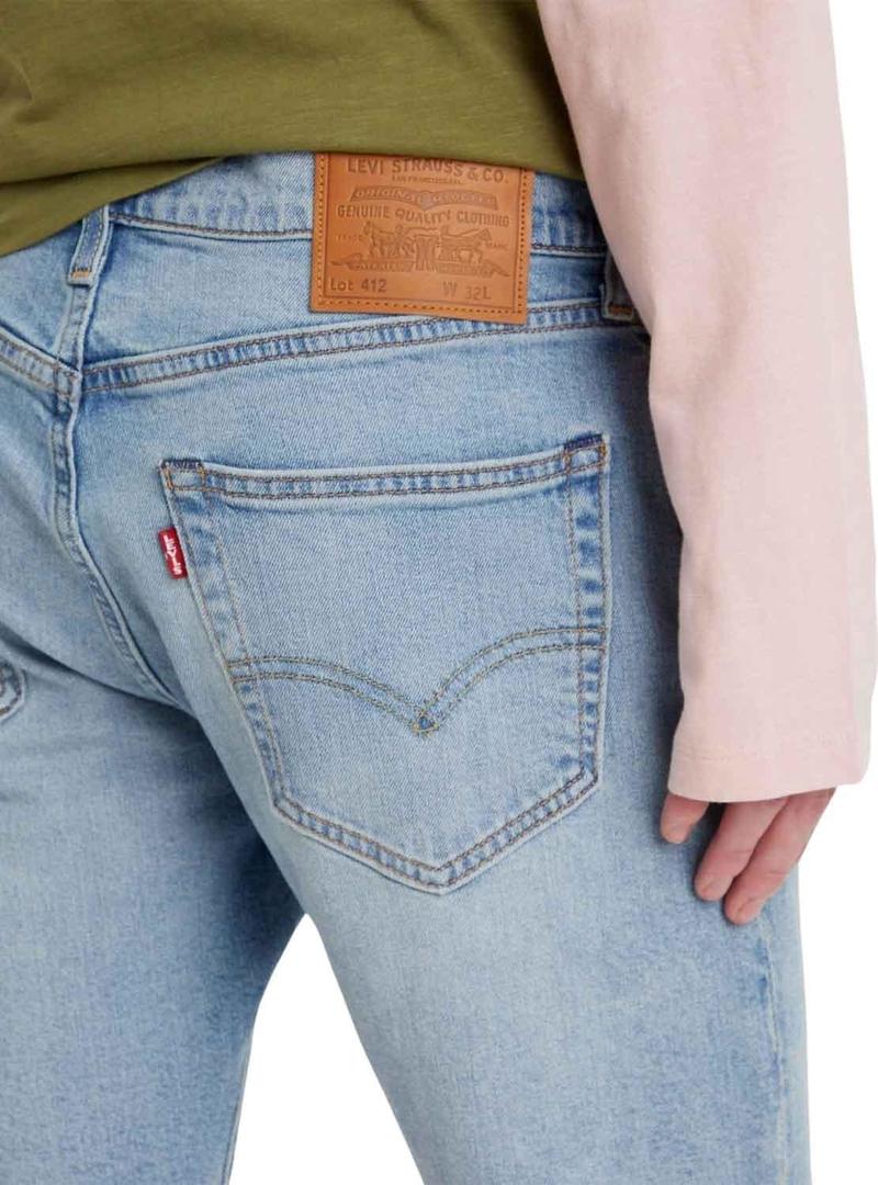Bermudas Levis. Modelo 412 Slim. Cor azul. 5 bolsos. Patch da marca nas costas. Fechamento por botão e zíper. Slim fit.