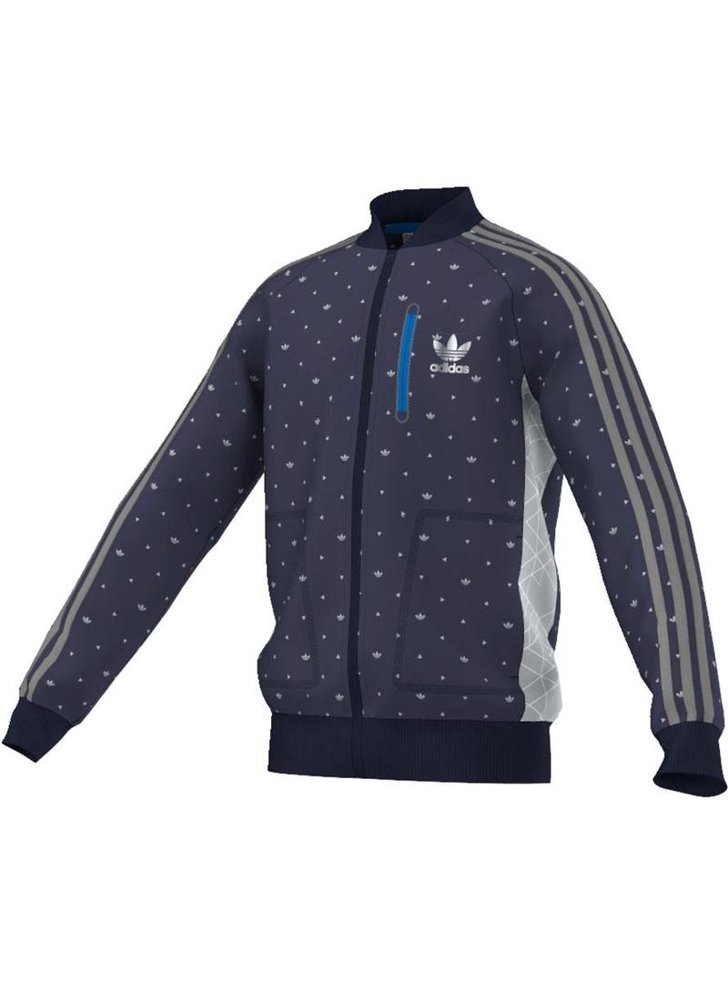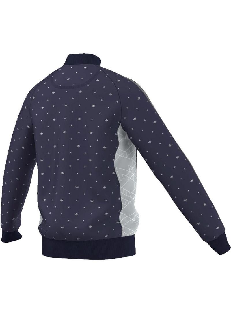 Adidas Sweat. Tem sido feito de tecido de malha. Triângulos padrão e trevos. Com painéis de contraste com padrões geométricos nas laterais. Vertical do bolso com zíper no peito.