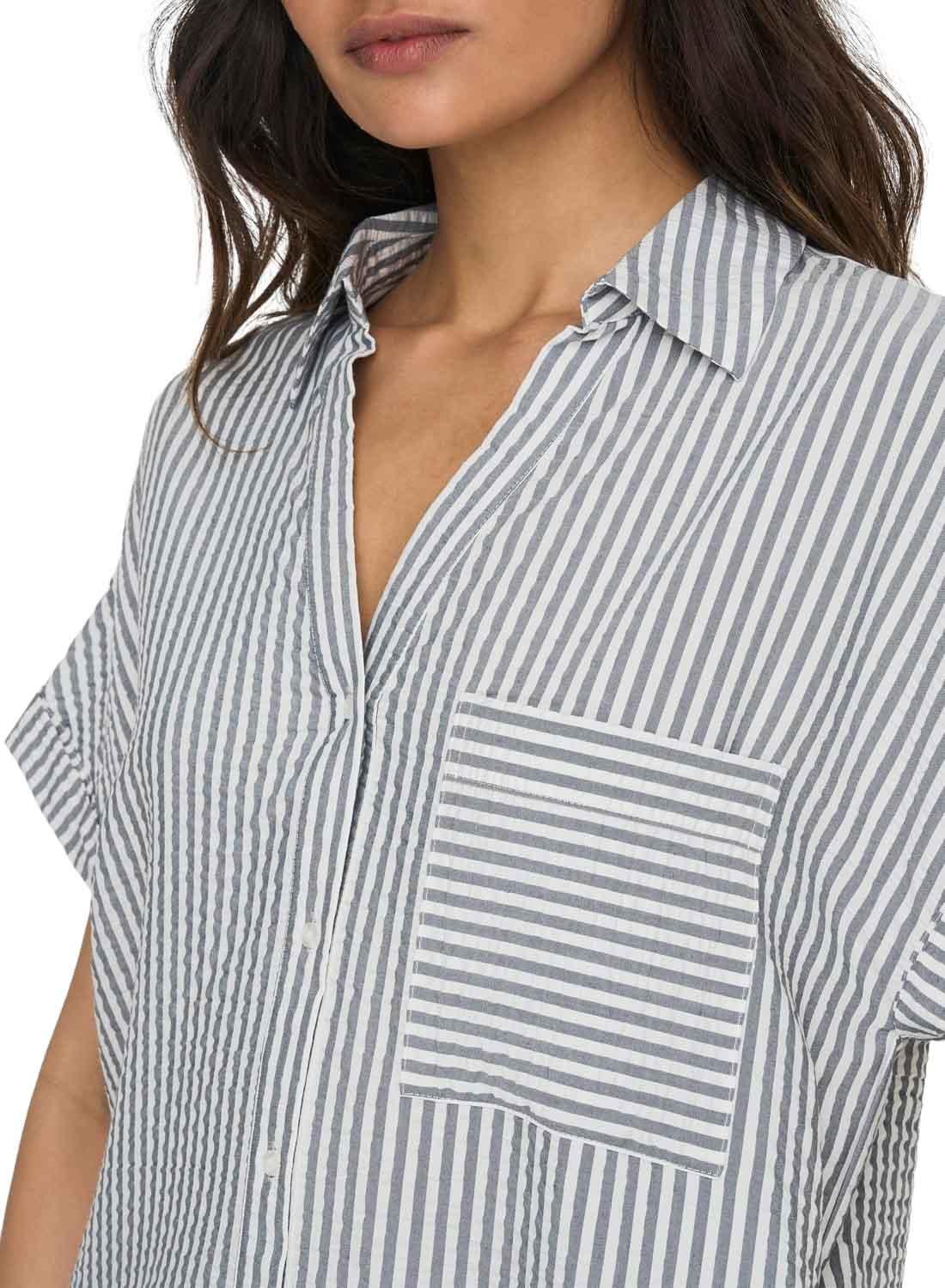 Camisa Only. Lista Printed. Manga curto. Decote em V. Ajuste solto. frontal fecho com botões. Bolso no peito. Traseira mais longa. A modelo veste tamanho S.