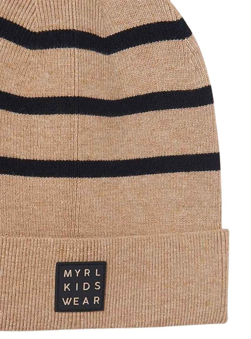 Chapéu Mayoral. Modelo de biscoito. Printed de Listras. Cor bege e preto. Etiqueta quadrada borracha. Com bainha. Tecido elástico.