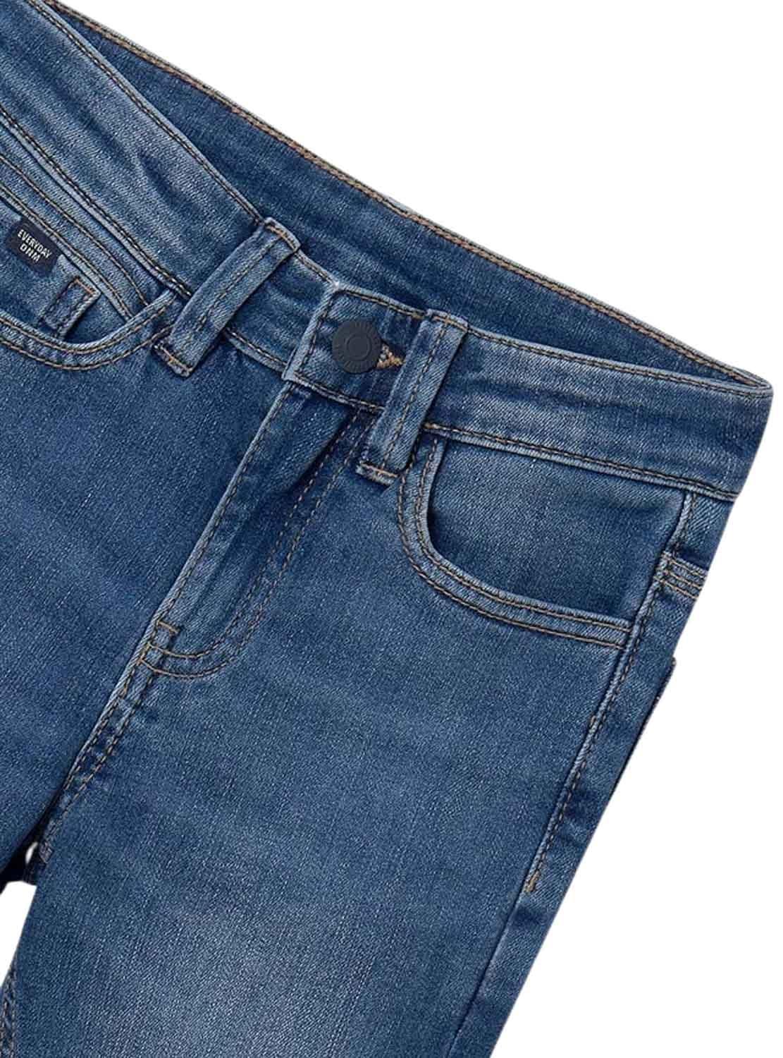 Calças jeans Mayoral. Tecido jeans. Corte Skinny. Cor azul. Cintura com presilhas para cinto. Fechamento por botão e zíper. Lado Bolsos.