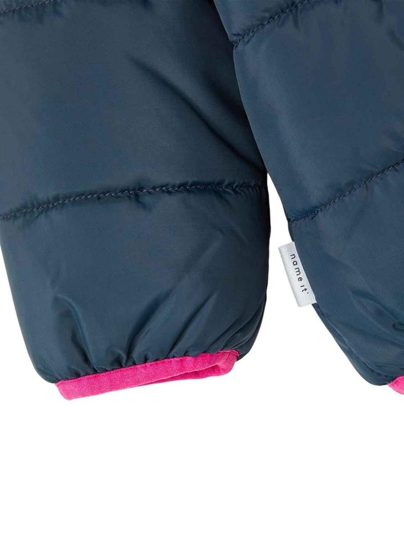 Preenchimento Casaca Name It. Modelo Memphis. Cor azul marinho. Com capuz removível. Fecho com zíper. Punhos e bainha elásticos. Lado Regular fit Bolsos. Pescoço longo.
