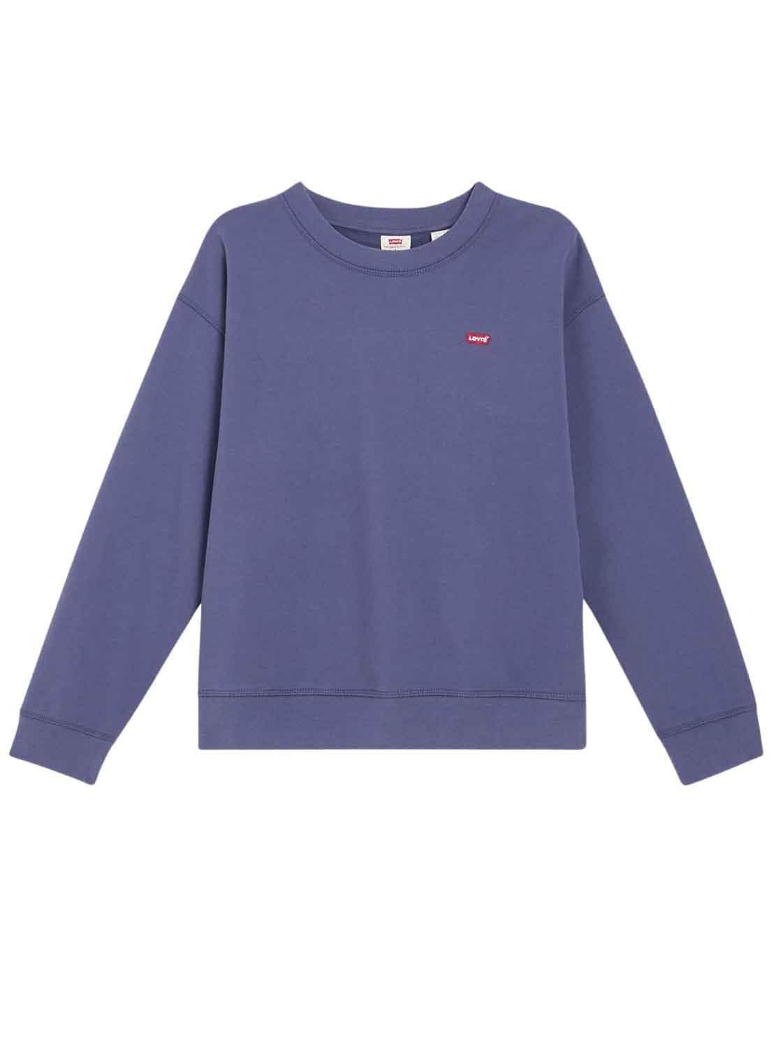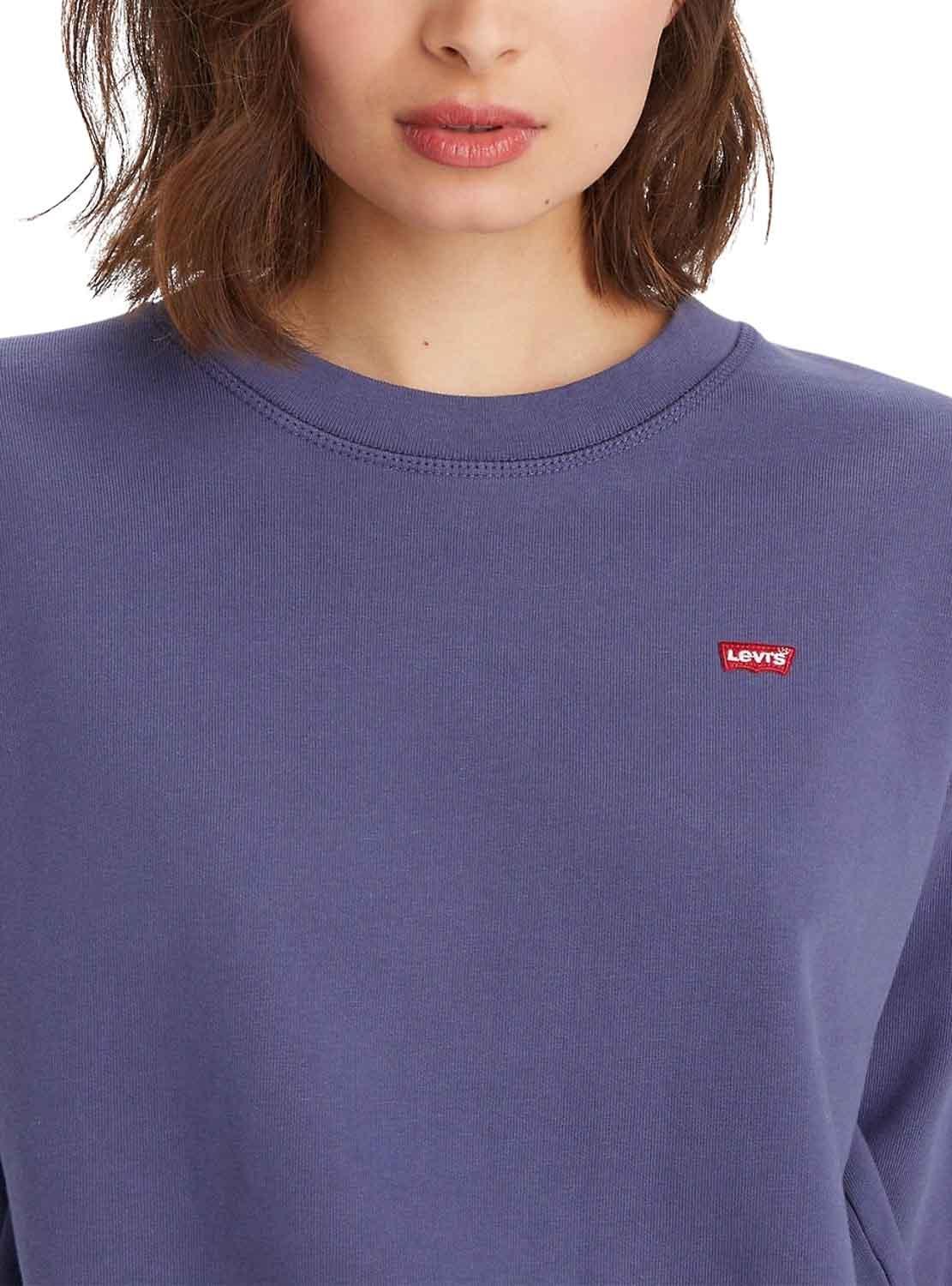 Sweat Levis. Modelo padrão. Cor roxo. Gola redonda elástica. Ajuste normal. Manga longo. Extremidades elásticas. Ombros caídos. Levis Logo no peito. A modelo está usando tamanho M.