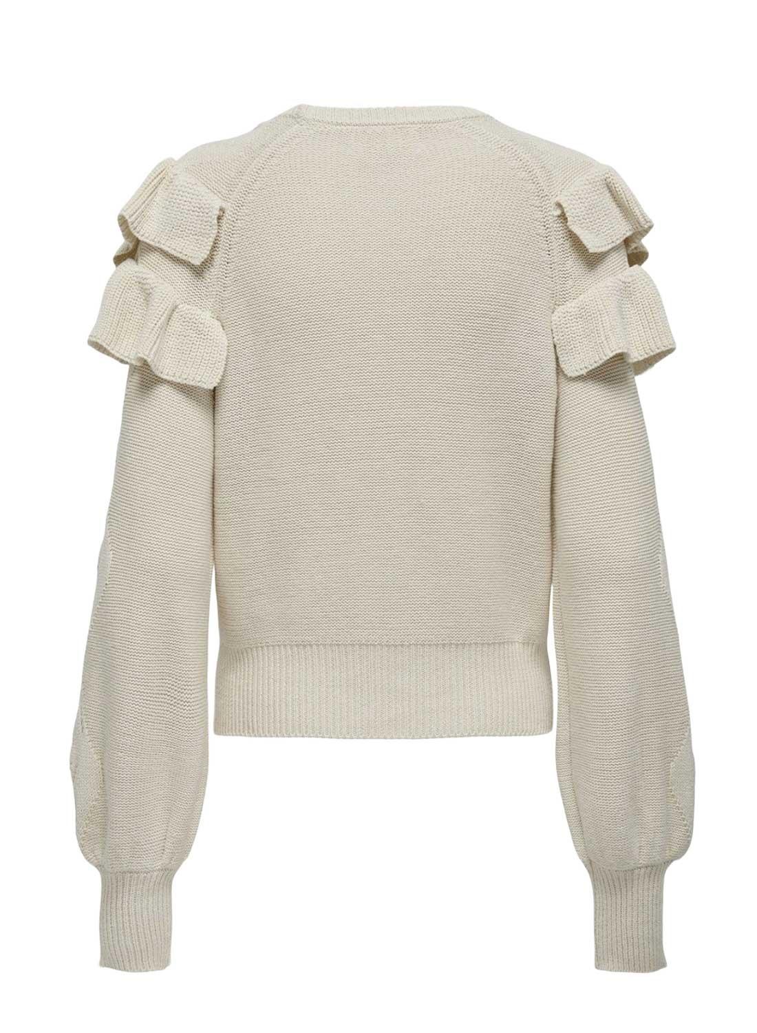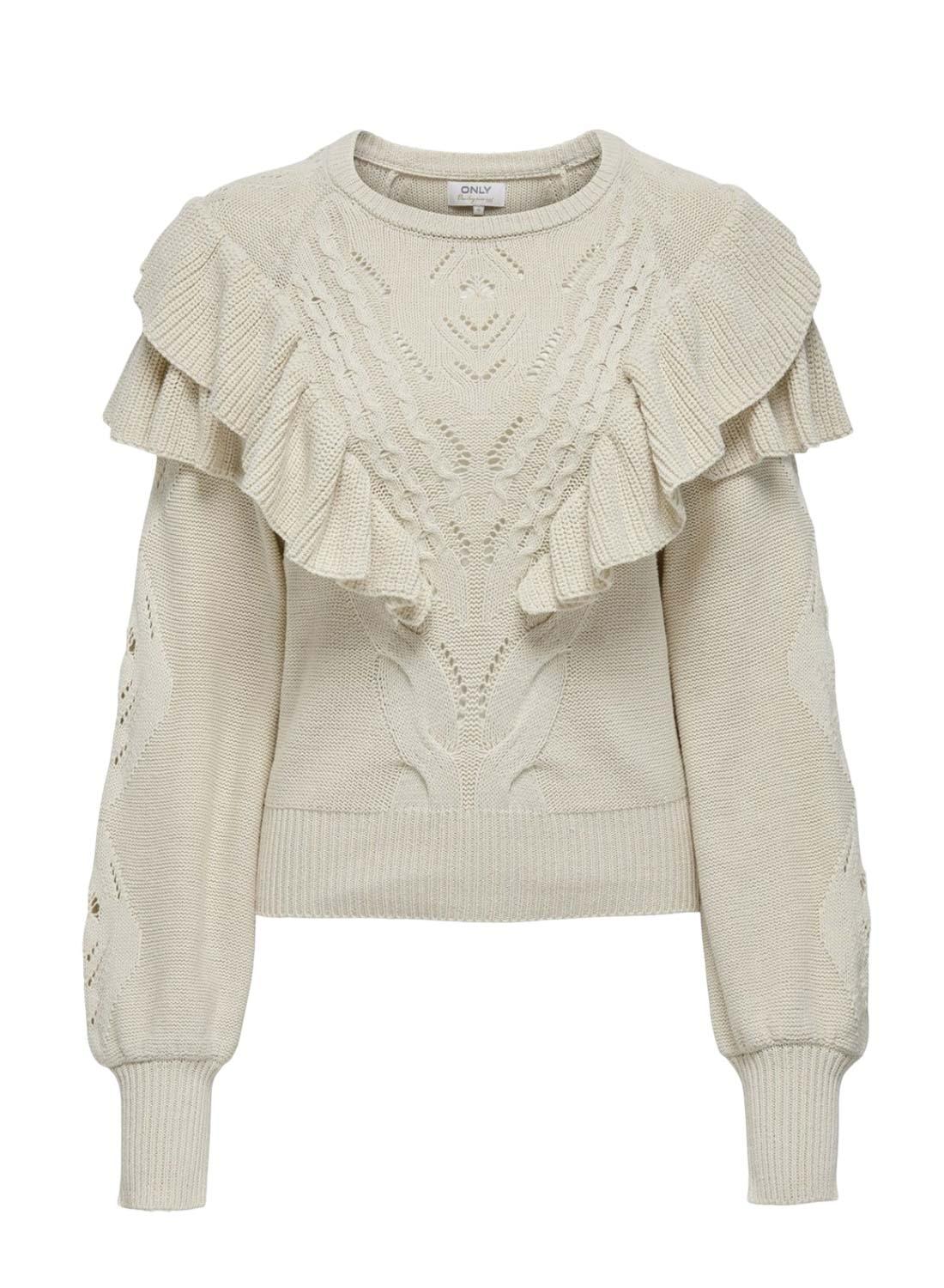 Camisola Only. Cor bege. Pescoço redondo. Manga longo com volume. Detalhe do babados. Tricô. Detalhes abertos no parte frontal. A modelo está usando tamanho S.