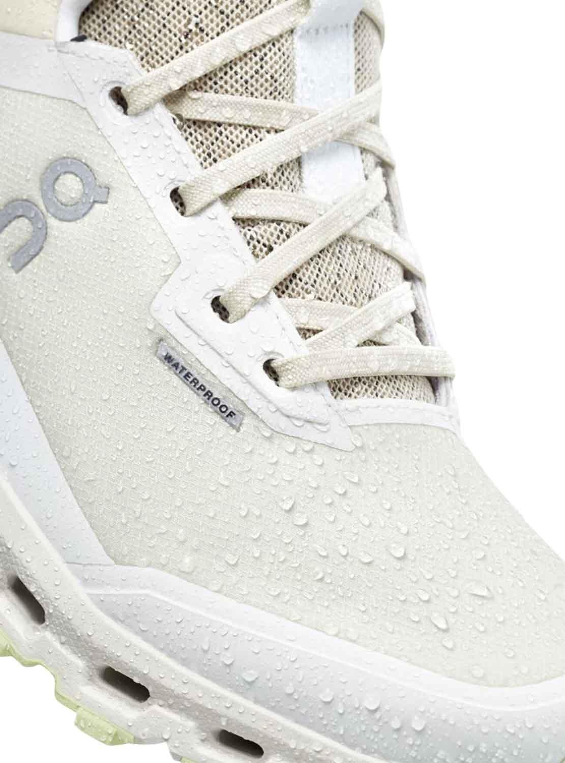 Sapatilhas On. Modelo Cloudroam. Cor bege com detalhes em limão. À prova d'água. Fechamento com cadarço. Clima frio para ideal. Leve 341gr. Asfalto ou sujeira para perfeito. Membrana Me100% reciclada e impermeável. Eixo médio.