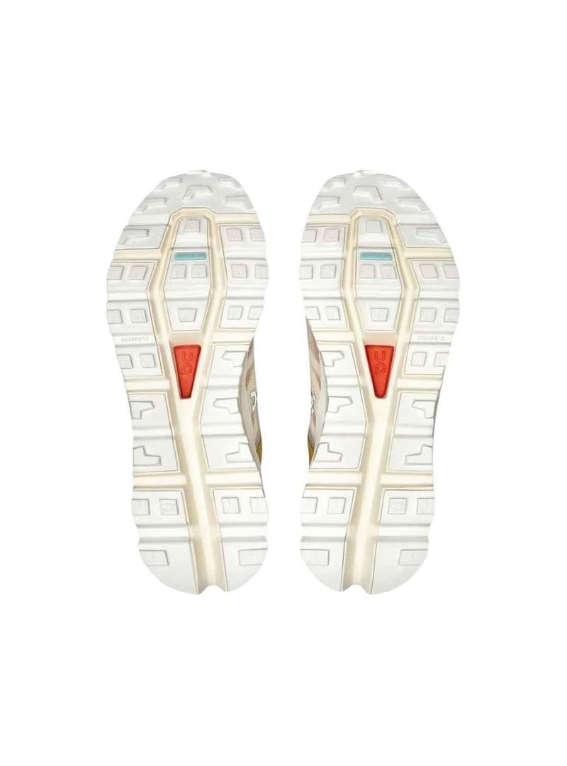 Sapatilhas On. Modelo Cloudvista. Cor bege. Detalhes em bronze e laranja. Sola de amortecimento leve. Cadarços elásticos. Logotipo lateral.