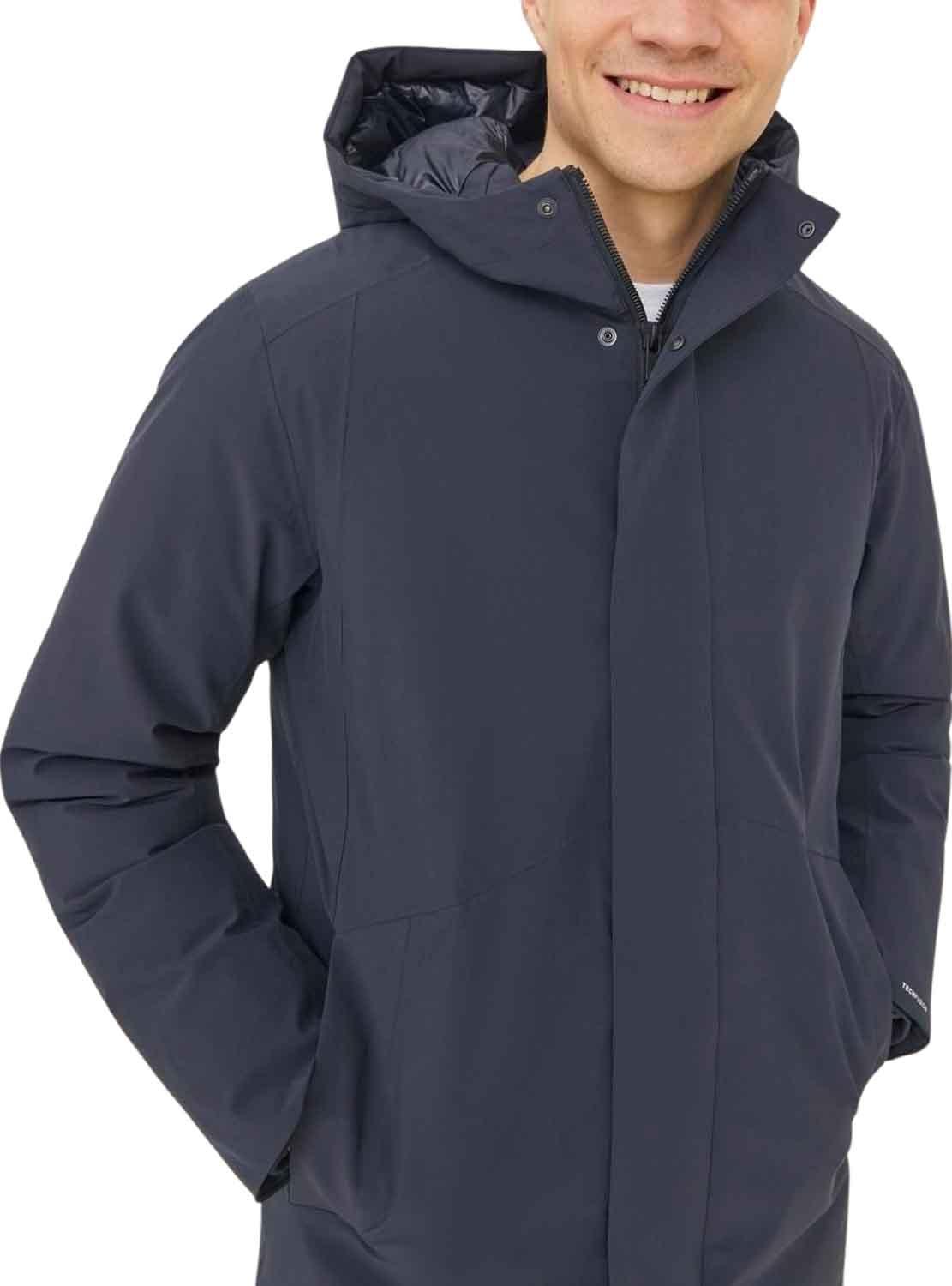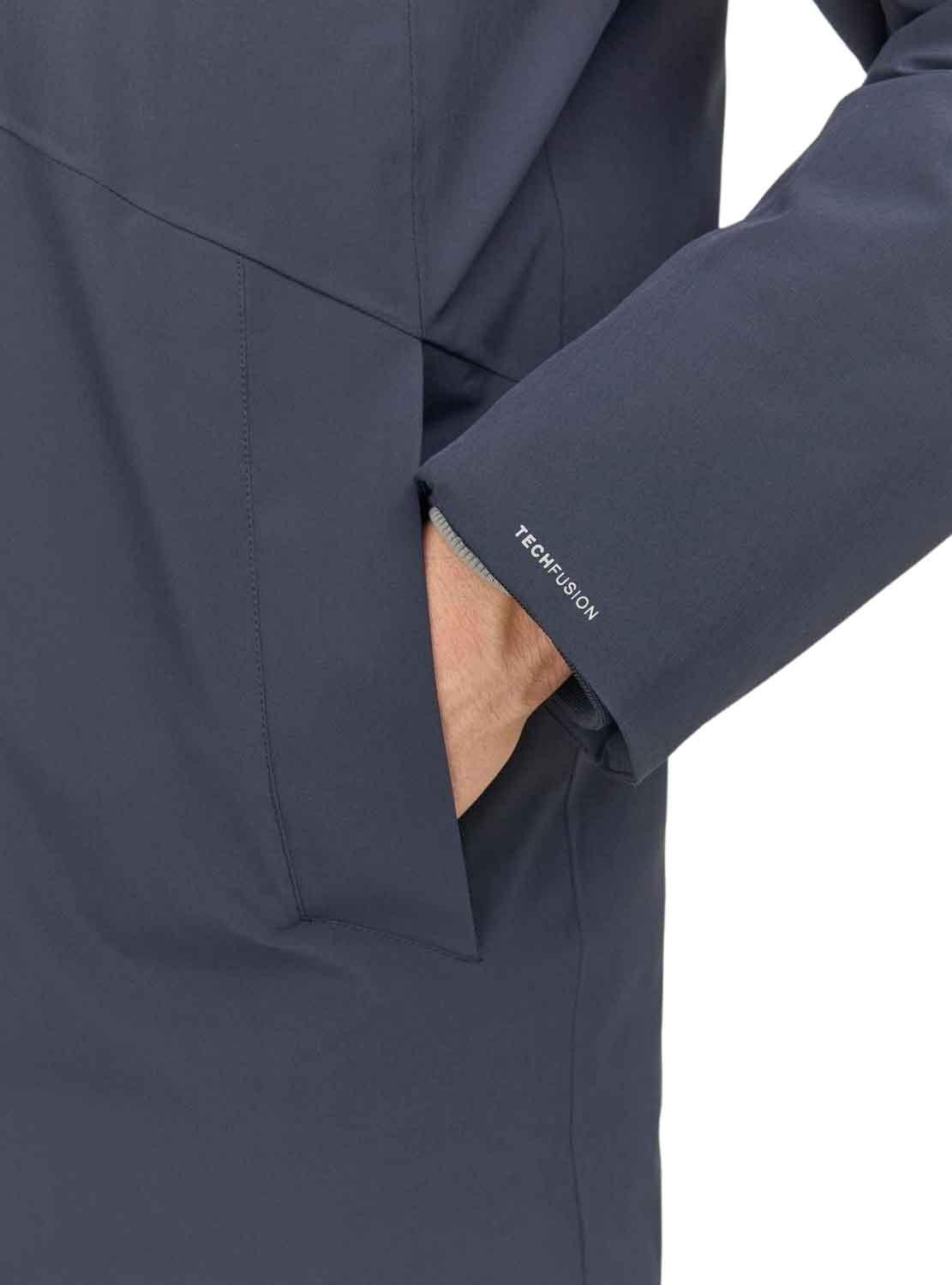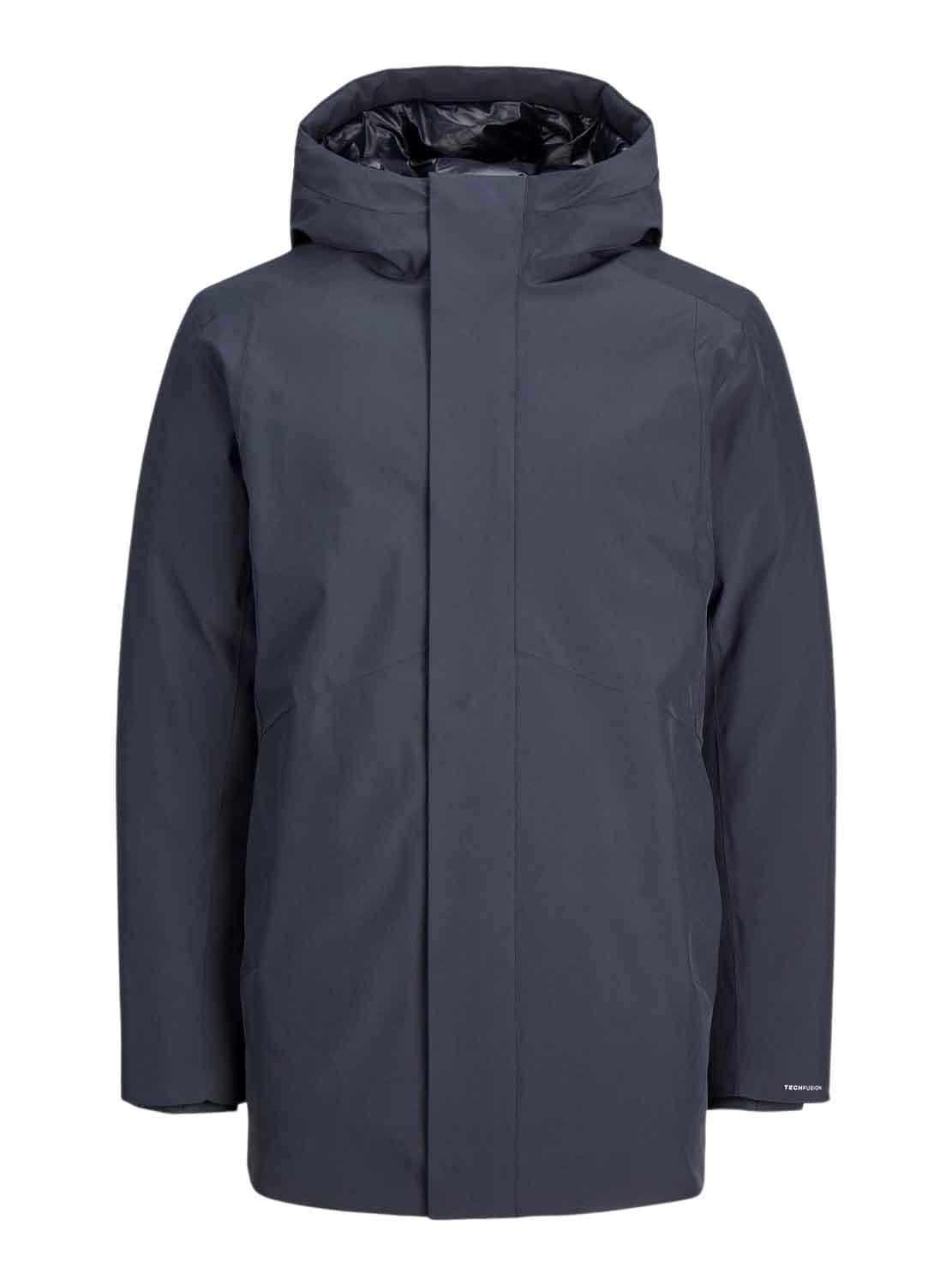 Casaca Jack & Jones. Modelo Blakeen. Cor marinho. Fecho com zíper e broches. Gola com capuz. Lado Bolsos. Fusão tecnológica.