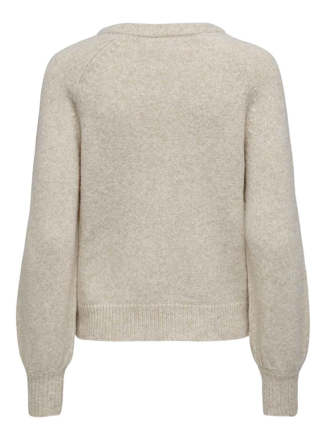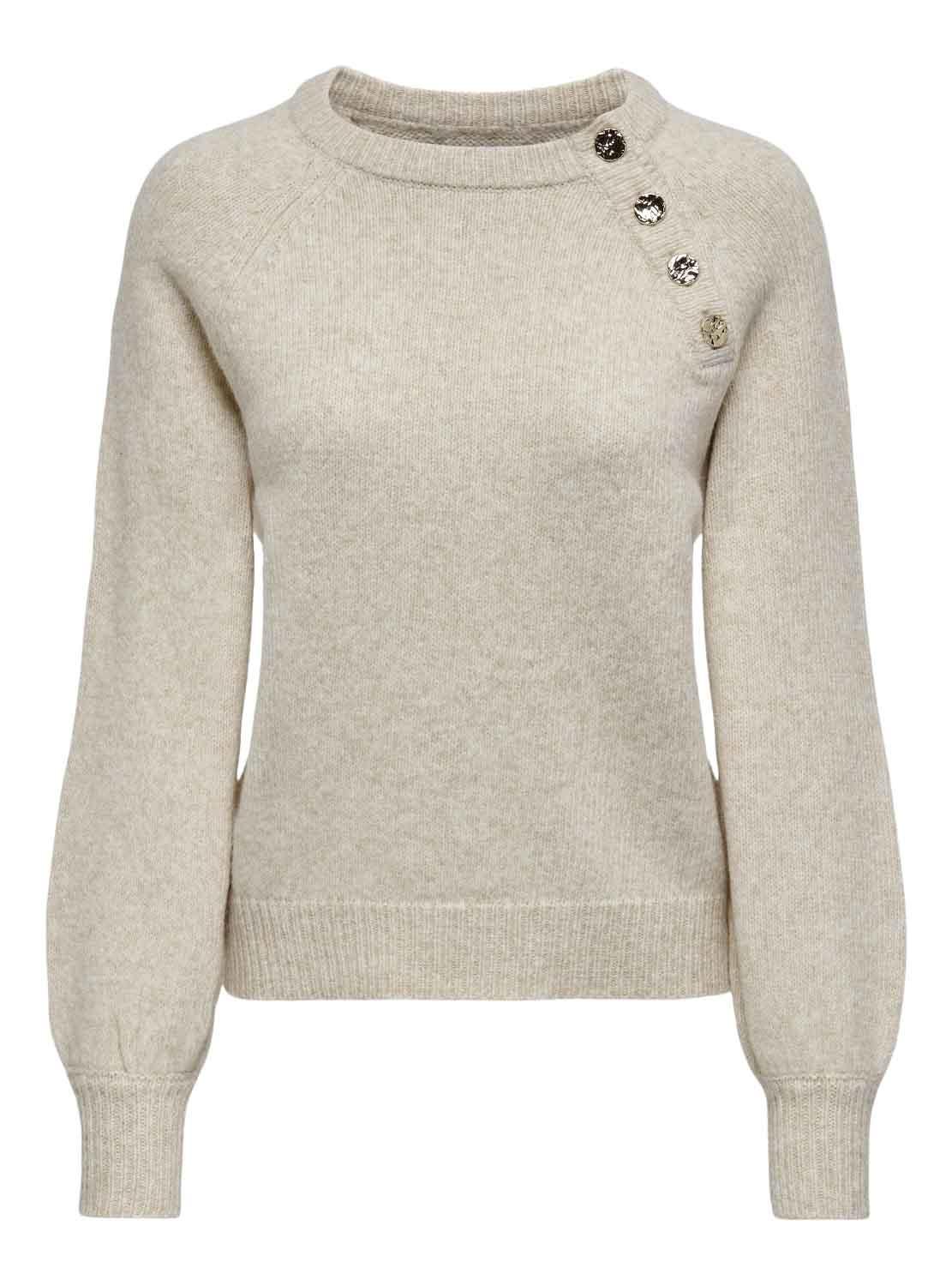 Camisola Only. Modelo Ema. Cor bege. Detalhe de botão no ombro. Pescoço redondo. Manga longo. Tricô. Extremidades nervuradas.