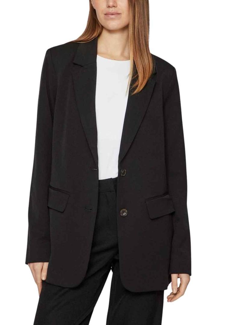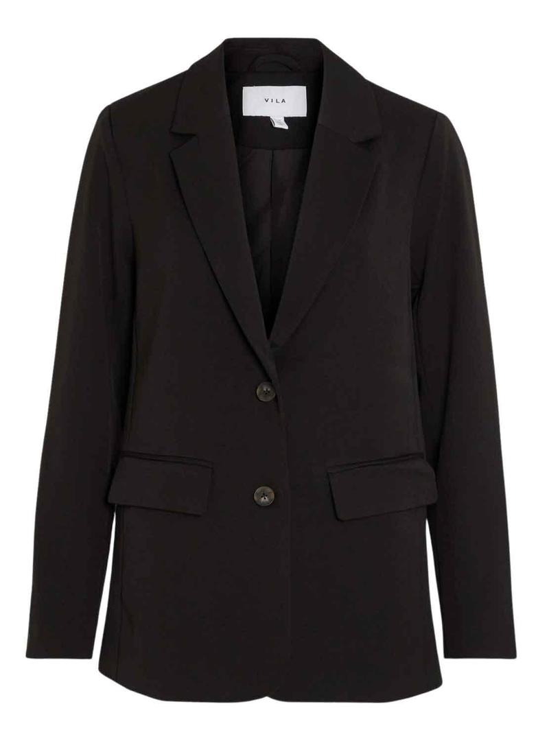 Blazer Vila. Modelo Vivaron. Cor preto. Ajuste solto. Fechamento com dois botões. Aba lateral do Bolso. Manga longo.