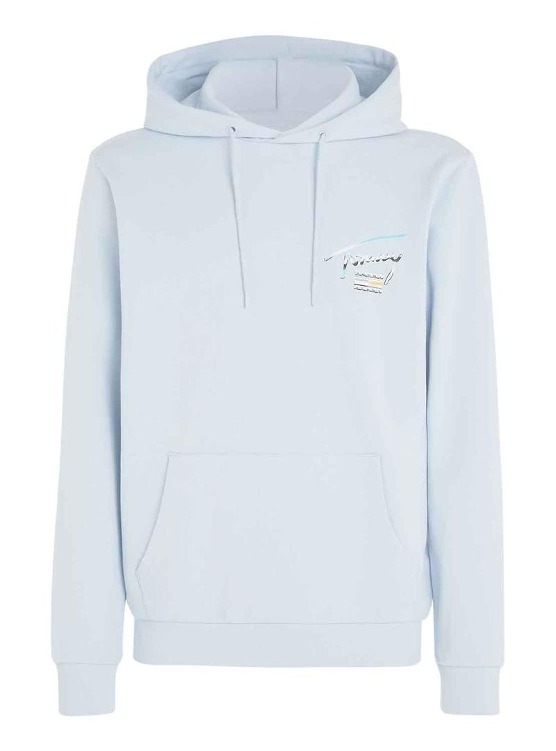 Sweat Tommy Jeans. Modelo REG Metálico. Cor azul claro. Com capuz. Detalhes distintivos. Logo no peito e nas costas. A modelo está vestindo tamanho M. Tecido puro algodão. Extremidades elásticas.