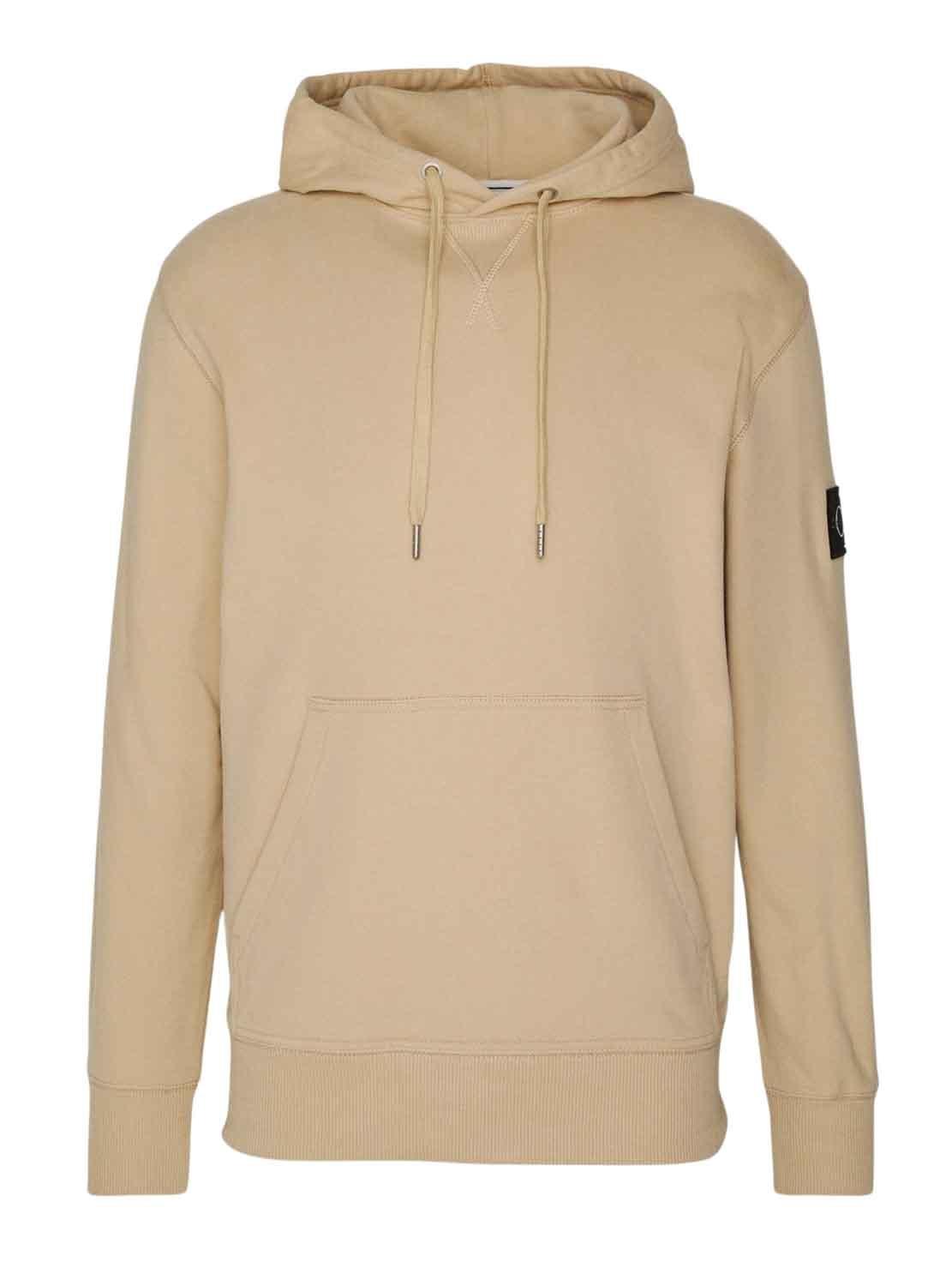 Sweat Calvin Klein Jeans. Modelo Badge Hoodie. Cor bege. Capuz com atacadores ajustáveis. Canguru Bolso. Extremidades nervuradas. Patch de logotipo na manga.
